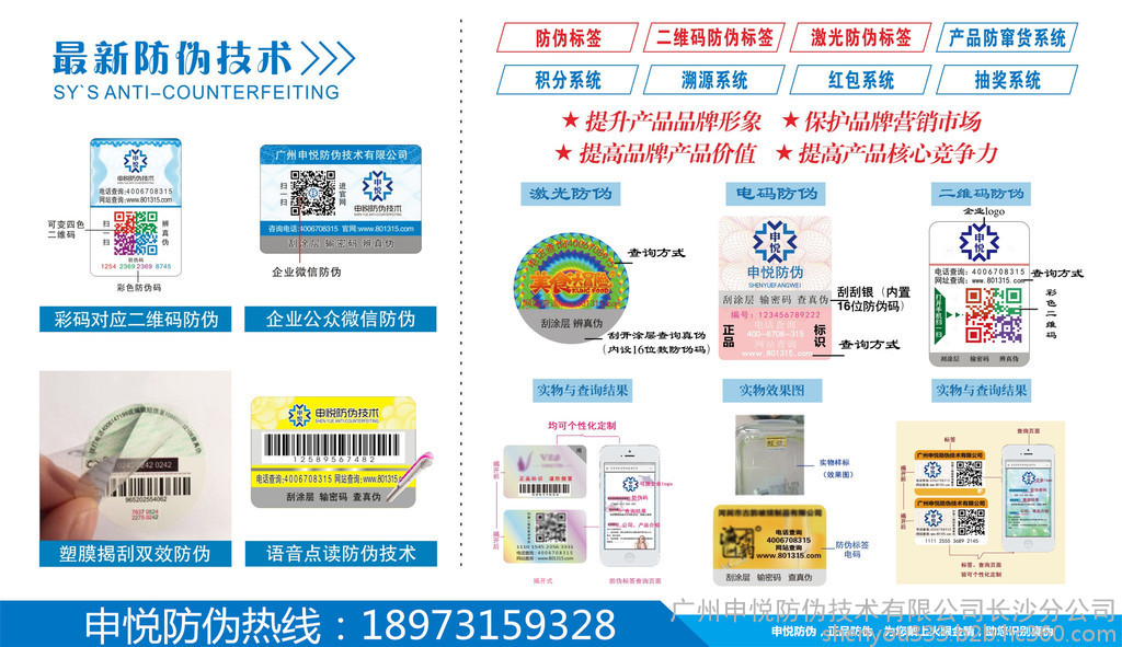 其原理是:为每一件入网的标识设置一个**的密码,并把这一密码储存在中心数据库中,同时建立起可靠全国各地查询电话查询系统。消费者购买到贴有电码防伪标识的商品,只需拨打电话,输入商品上的密码,即可知道产品的真伪,从而突破了传统的防伪产品容易被批量防冒及消费者不易识别的局限性。随着信息技术的发展,现在的电码防伪查询方式已经可以是短信、网络等方式查询,固称数码防伪,标一防伪提供全方位的电码防伪服务。