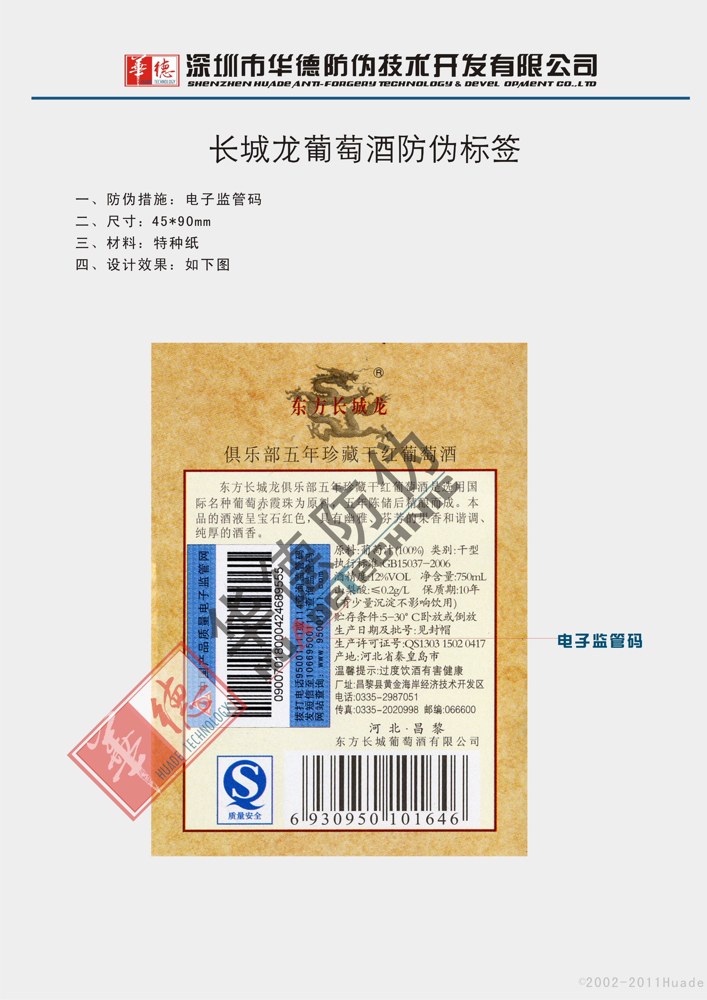 长城龙葡萄酒防伪标签采用我司电子监管码防伪技术