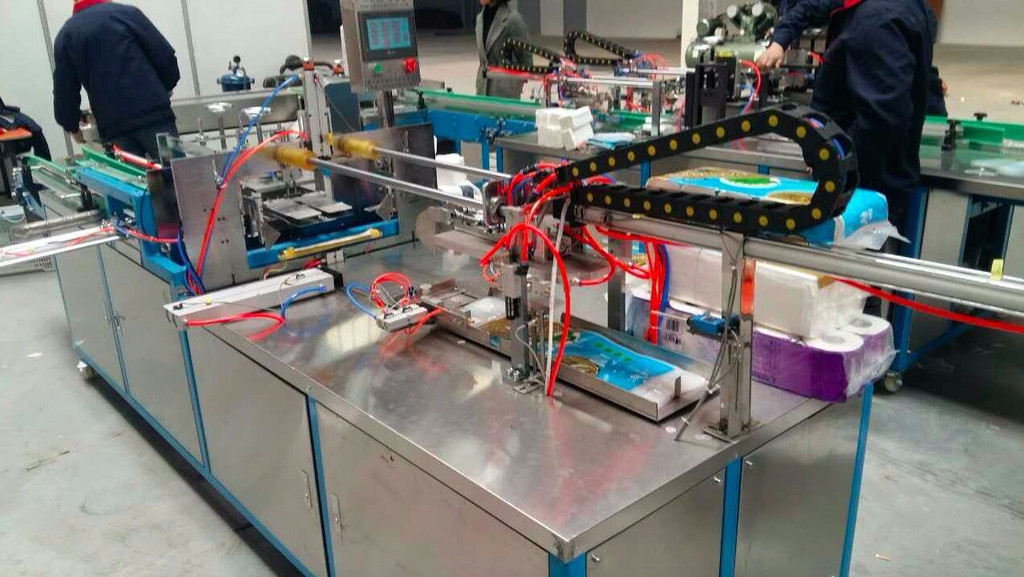 1中包机可以包卫生纸扁卷、卫生纸圆卷、抽纸,机器能够实现自动撑袋,自动套袋,自动封口为一体的自动包装。,