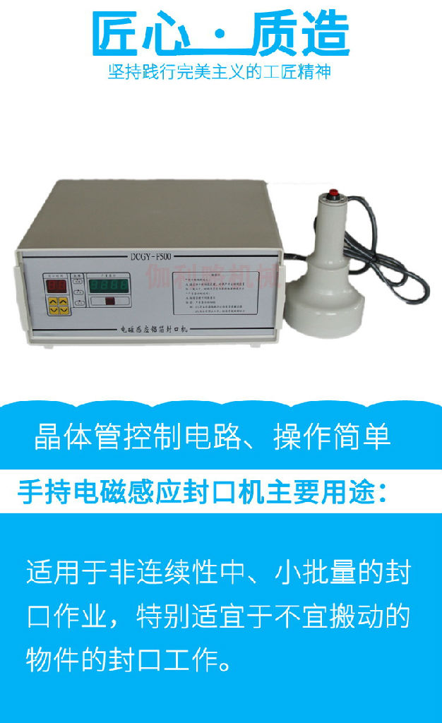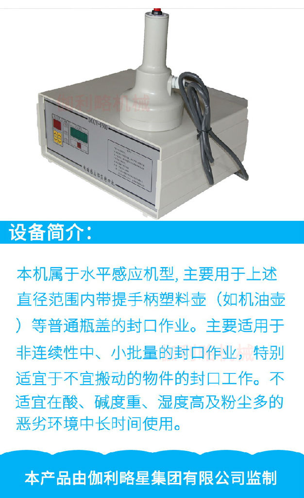 GDGYF-S500D电磁感应封口机主要适用于瓶盖旁带有提手柄 (如机油瓶等) 塑料、玻璃等非金属瓶瓶口的封口作业。不适宜用于金属瓶、无螺纹的瓶盖、带空隙的高形瓶盖、瓶口直径小于φ20和大于φ60毫米的封口作业。特别适合产量小、批量不大非连续性封口作业的用户。