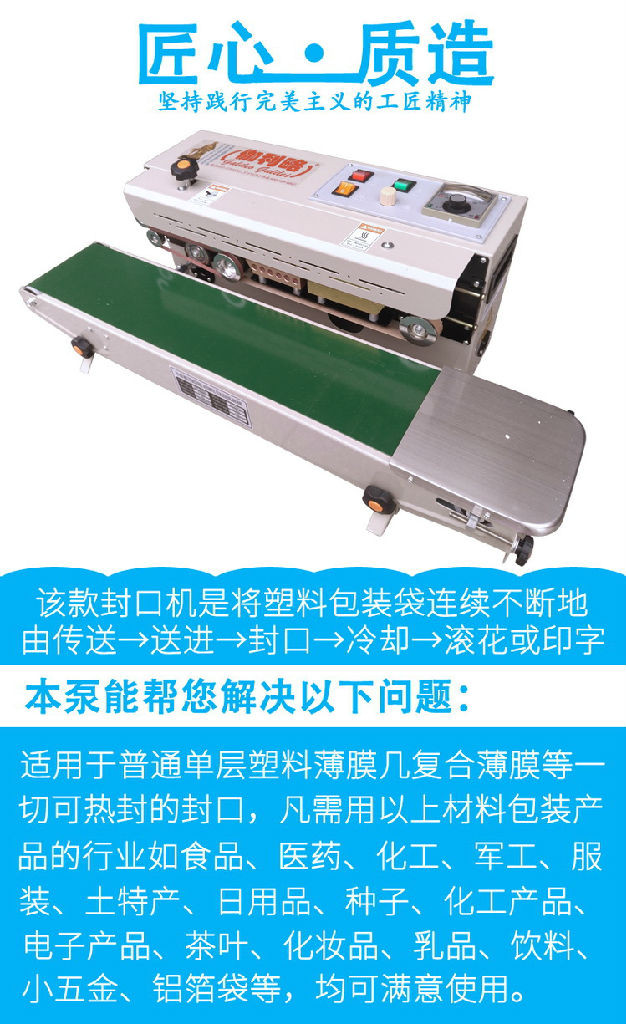 3、该款封口机是将塑料包装袋连续不断地由传送→送进→封口→冷却→滚花或印字。具有连续封口效率高、封口质量好、结构合理、操作方便等特点。可与各种包装流水线配合使用,其封口长度不受限制,并适应于各种不同材料的塑料薄膜袋。