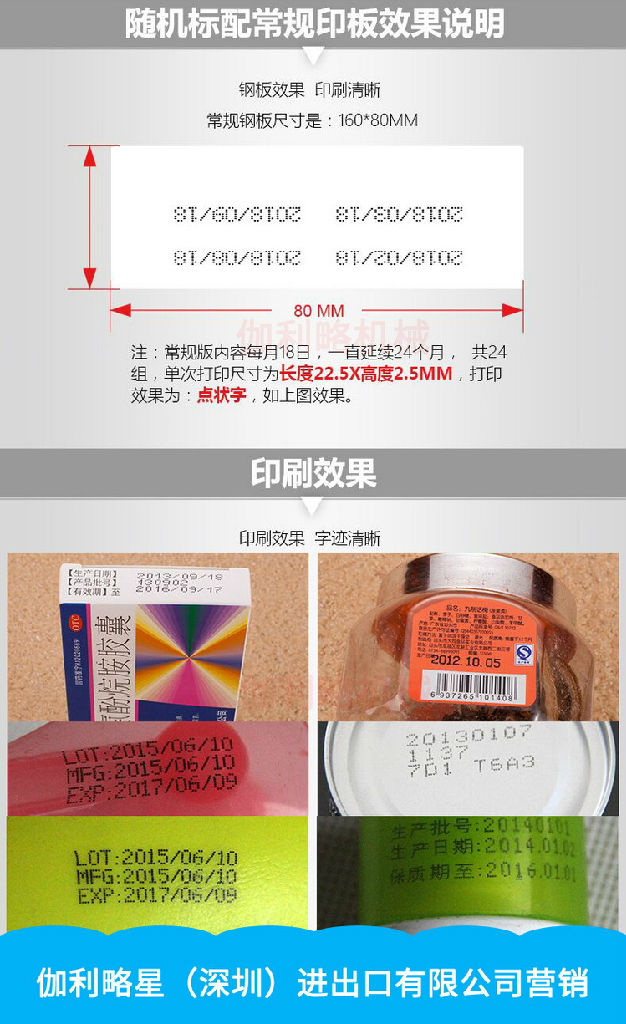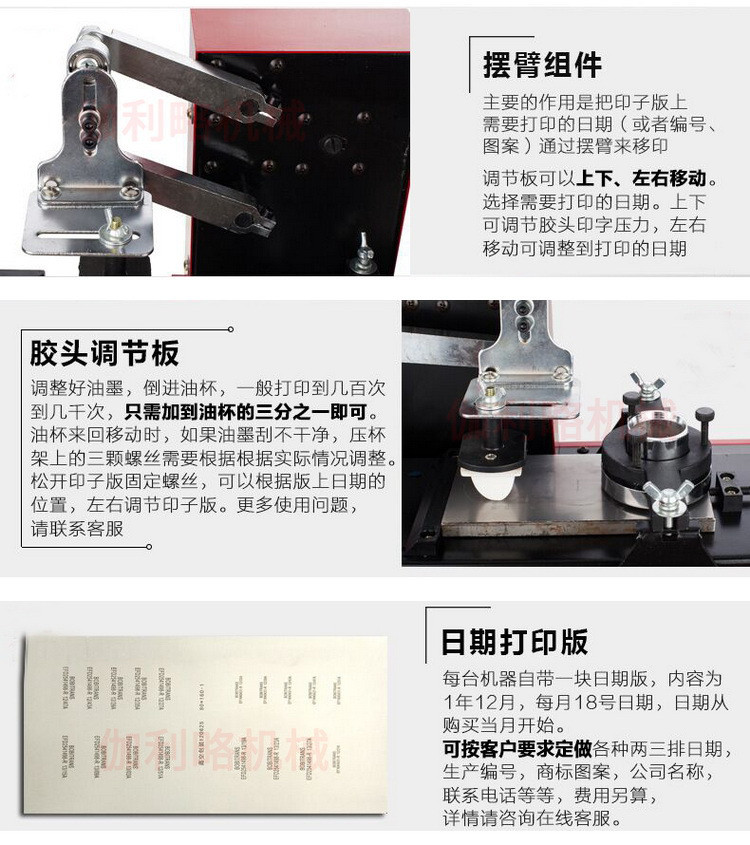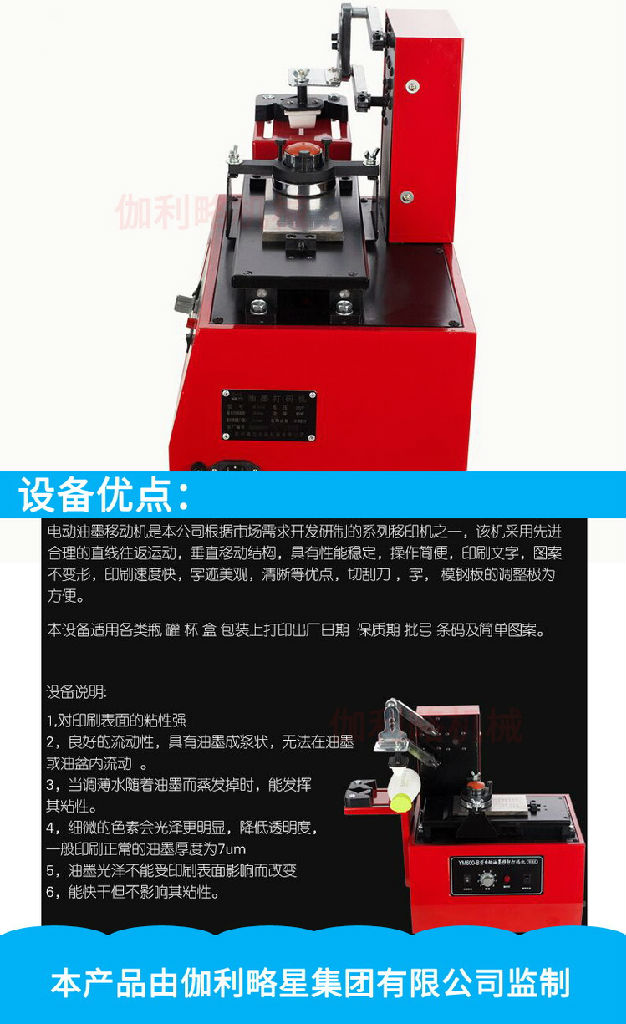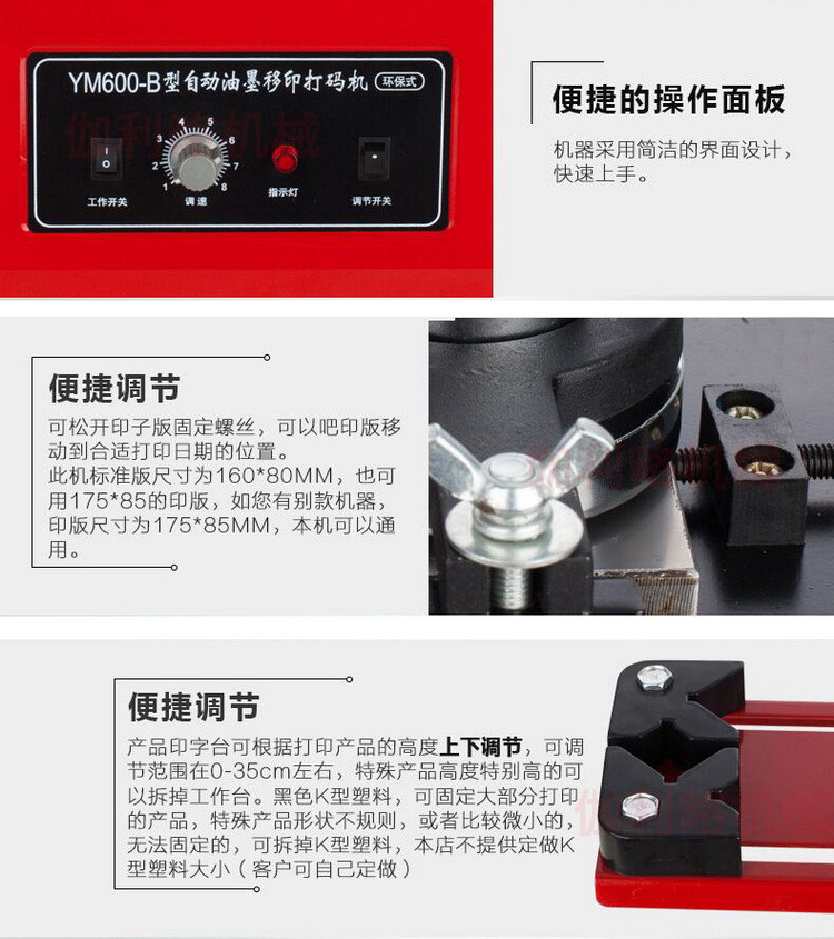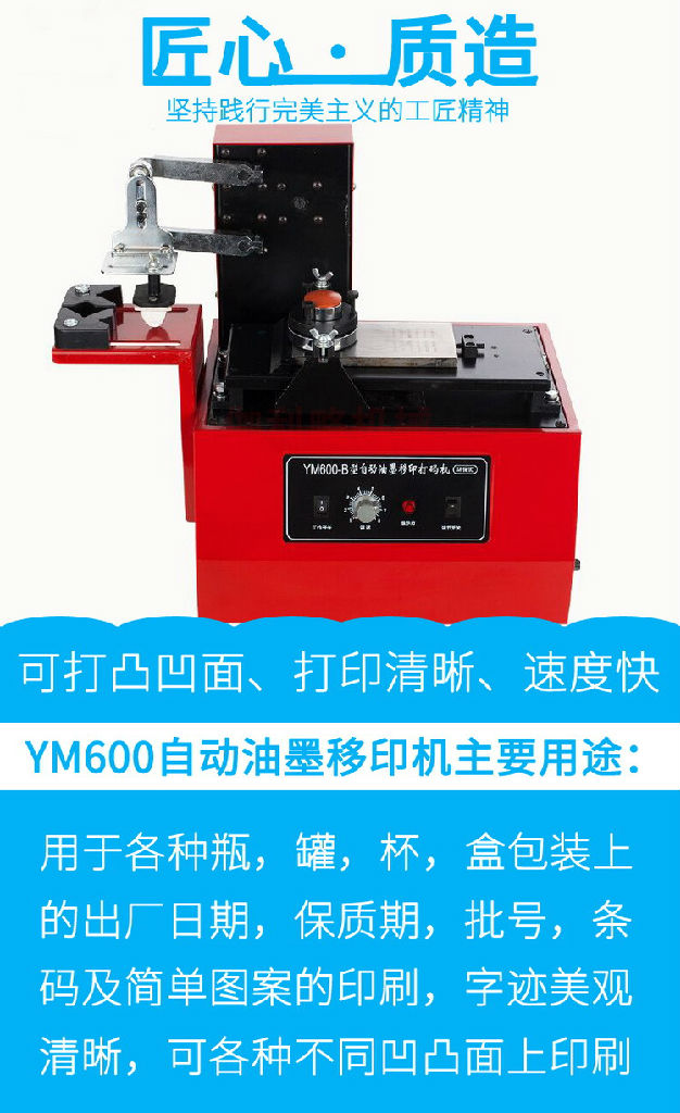 油墨移印打码机适用于食品、罐头、饮料、化妆品、电器、制药等行业的各类瓶,罐,杯,盒等包装上产品打印出产日期、保质期、批号条码、图案等,可在各种材料,不同面上印刷,印刷速度快,字体美观、清晰。打印后的效果达到喷码机喷印效果。凹版移印板分方形板和圆形活动板两种,可定制各种所需要的印刷字符。电动油墨移印机分为圆盘油杯型、长板油杯型、方板刮刀型三种,可以在金属、塑料、玻璃、陶瓷、薄膜、尼龙等产品上的任意部位凹凸不平面