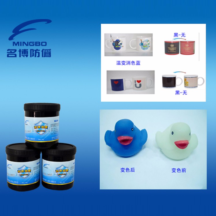 原有颜色加热后消失,降温后可恢复原有颜色。可丝印、凹印、胶印、水转印、热转印、UV丝印、UV胶印、UV柔版,丝印可印刷做纸张、塑胶、尼龙、ABS、PET、PP、金属、玻璃,用200目丝网印刷。