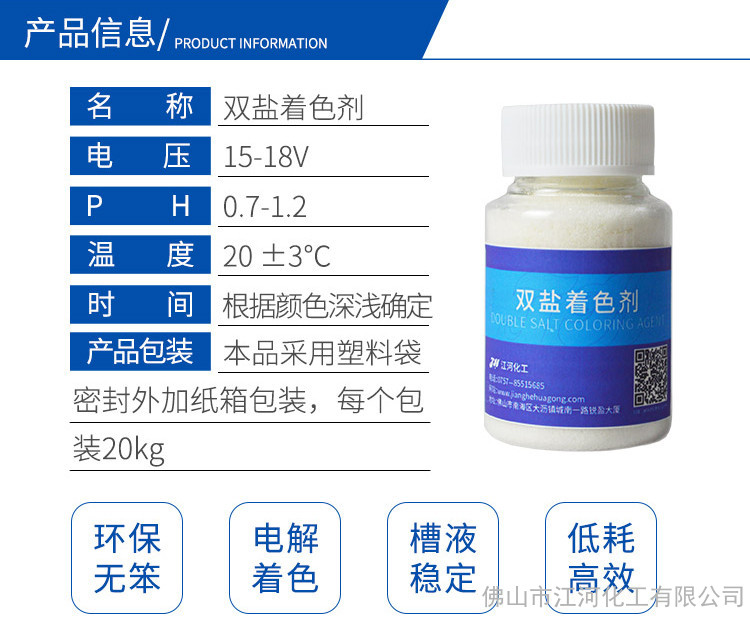 江河化工双盐着色添加剂(JH-L-04B)是由抗氧化剂、还原剂、络合剂、分散剂、渗透剂 、电位调节剂等多种有效成分复配而成,适合于锡、镍混合体系电解着色。本品为白色粉状固体,易溶于水,性能稳定。