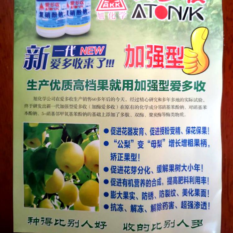 功效:天然调节,催红不催熟,增加含糖量,减少日灼果,加速果实表皮色素细胞的分裂,促进果品着色均匀,果色鲜亮,甜度增加,提高产量。