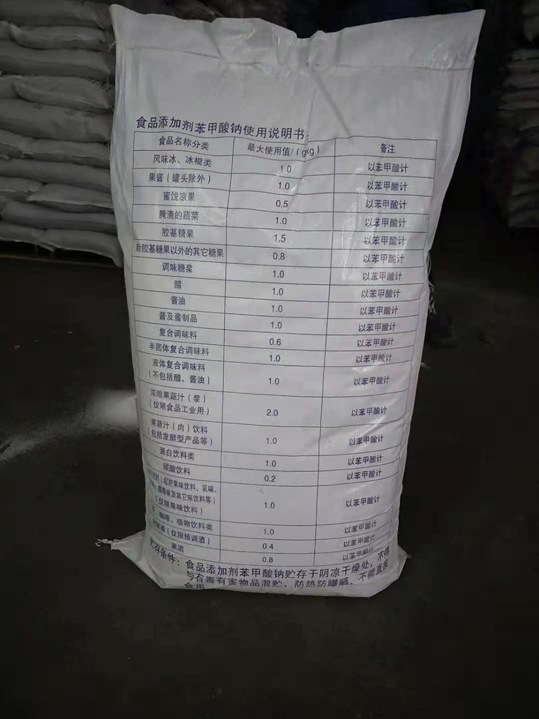 是一种白色颗粒或晶体粉末,无臭或微带安息香气味,味微甜,有收敛味。也称安息香酸钠,相对分子质量144.12。在空气中稳定,易溶于水,其水溶液的PH 值为8,溶于乙醇。