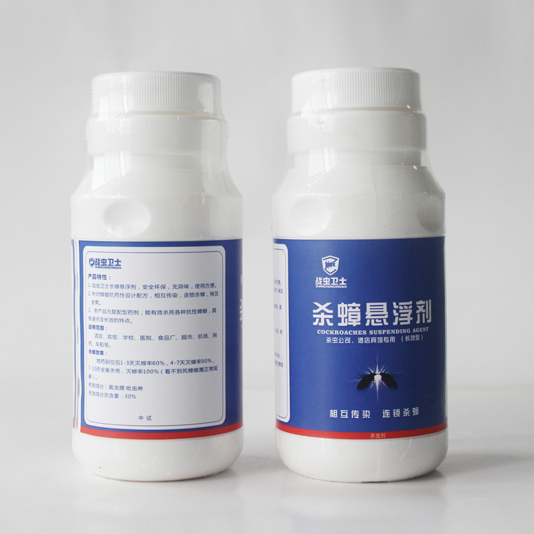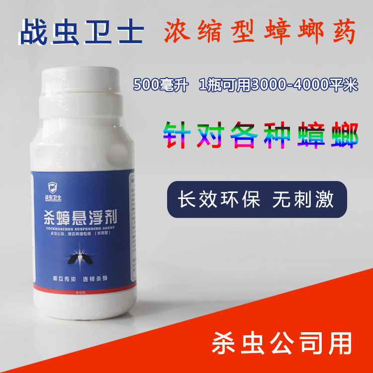 产品规格:500ml/瓶 24瓶/箱 使用范围: 家庭、宾馆、酒店、医院、食品厂、超市、机场、车船及各种高标准的公共场所。 使用方法: 1.对于酒店、宾馆等蟑螂密度较大的场所,取本品蟑螂药兑水稀释150倍,对于家庭等蟑螂密度较小的场所,取本品兑水稀释200倍。 2.使用时用喷雾剂对准蟑螂经常出没的地方(酒店、宾馆后厨,墙体所有边角缝隙,水池下,暖气后面,冰箱冰柜底下,橱柜和电器等不方便喷药的地方可用毛笔或毛刷沾药水涂刷),进行喷雾,湿而不流。 杀蟑效果: 喷药后1-3天灭蟑率达30%,4-7天灭蟑率90%,7-10天全巢杀绝。