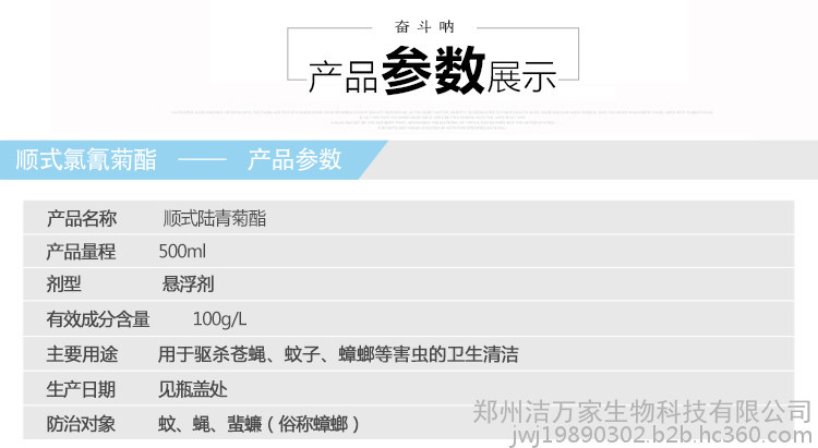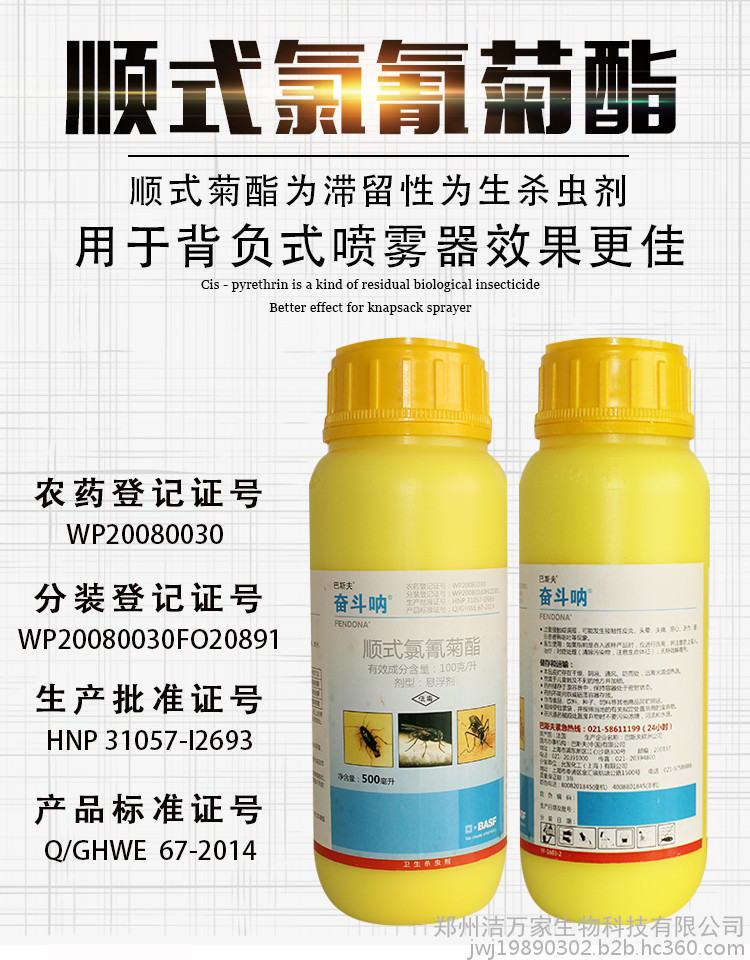 ??10%奋斗呐悬浮剂,由德国巴斯夫公司生产,是当今****的防控蚊子、苍蝇、蟑螂的卫生杀虫剂之一。有效成分为顺式氯氰菊酯。它击倒速度快、持效期长、适合多种环境的害虫处理。尤其对蟑螂、苍蝇、蚊子、蚂蚁、臭虫等卫生害虫均有很好的防治效果。该产品使用方便,尤其能进行滞留喷雾、超低容量喷雾、蚊帐浸泡等各种作业。