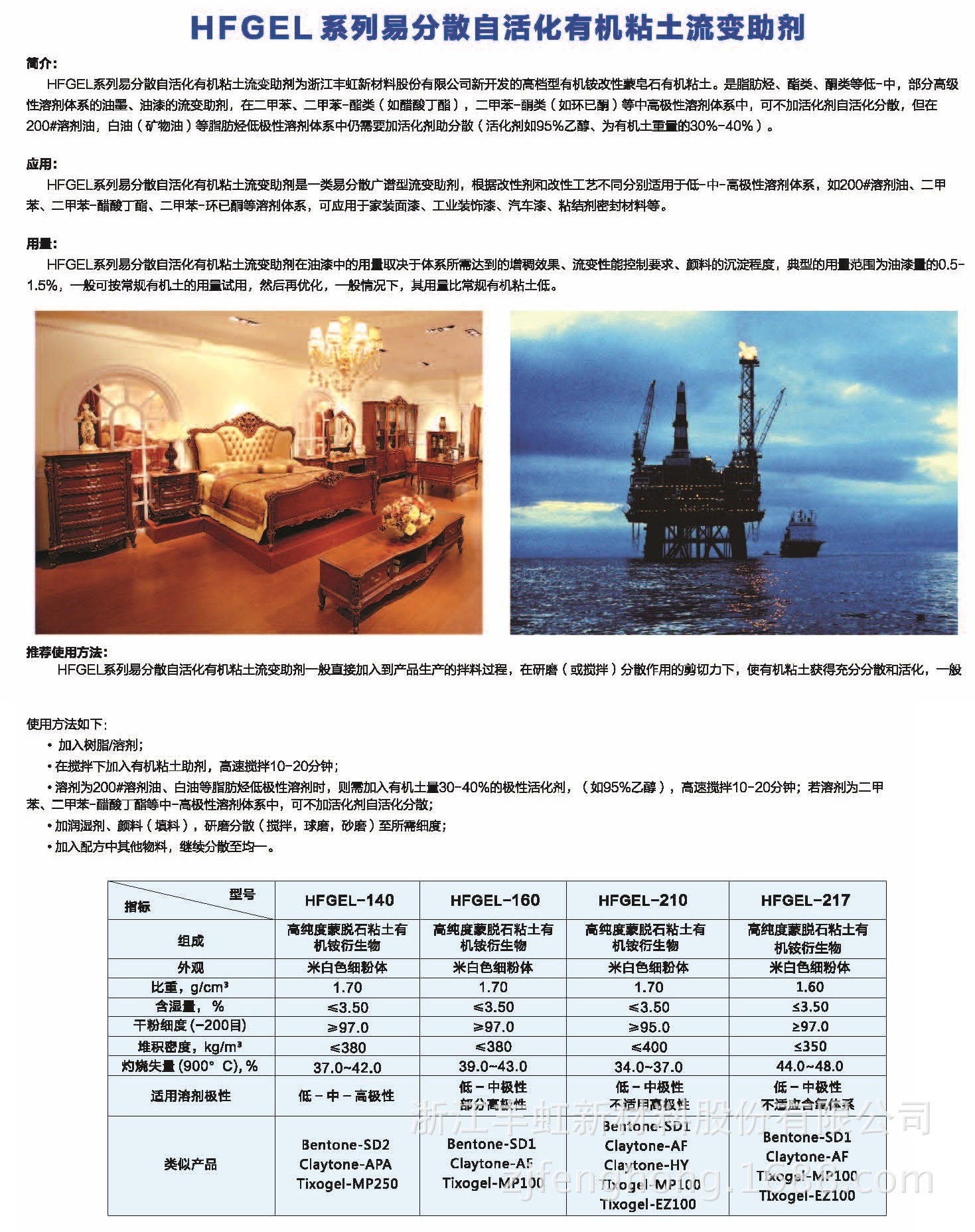 HFGEL-140流变助剂一般直接加入到产品加工的研磨过程中,在研磨(或搅拌)分散颜料的剪切力下,HFGEL-140获得充分分散和活化。