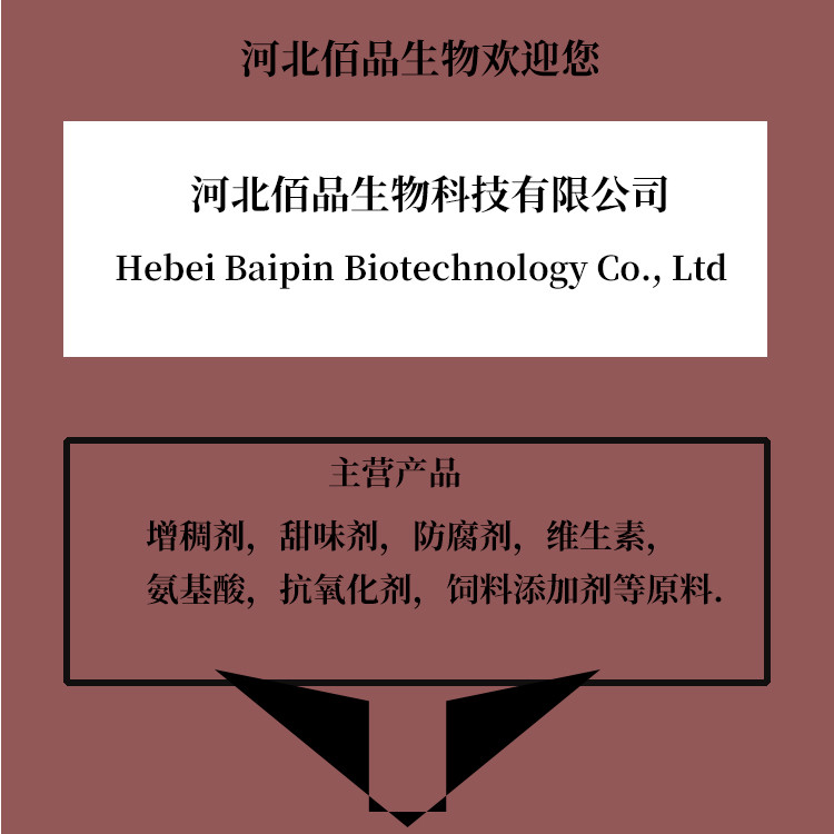 公司简介河北佰品生物科技有限公司经销批发的食品添加剂、增稠剂、甜味剂、酸味剂、乳化剂、抗氧化剂、营养强化剂、防腐保鲜剂畅销消费者市场,在消费者当中享有较高的地位,公司与多家零售商和代理商建立了长期稳定的合作关系。河北佰品生物科技有限公司经销的食品添加剂、增稠剂、甜味剂、酸味剂、乳化剂、抗氧化剂、营养强化剂、防腐保鲜剂品种齐全、价格合理。河北佰品生物科技有限公司实力雄厚,重信用、守合同、保证产品质量,以多品种经营特色和薄利多销的原则,赢得了广大客户的信任。