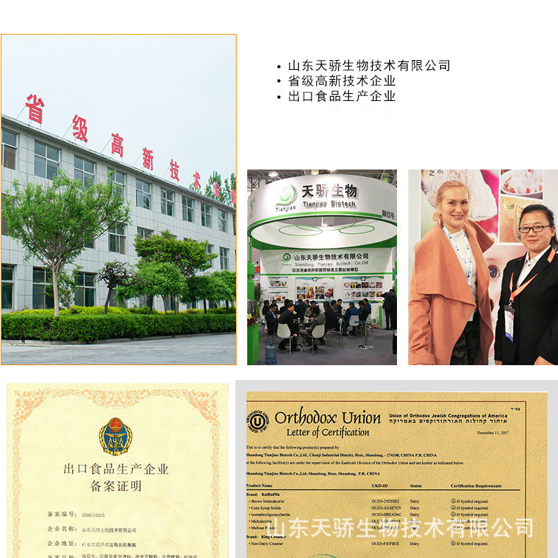 生产主营:植脂末、麦芽糊精、低聚异麦芽糖、高麦芽糖粉、麦精、大豆低聚肽、玉米肽等产品专业生产加工的私营独资企业,公司总部设在山东省菏泽市陈集工业区,山东天骄生物技术有限公司国内业务部拥有完整的质量管理体系。山东天骄生物技术有限公司国内业务部的诚信、实力和产品质量获得业界的认可。