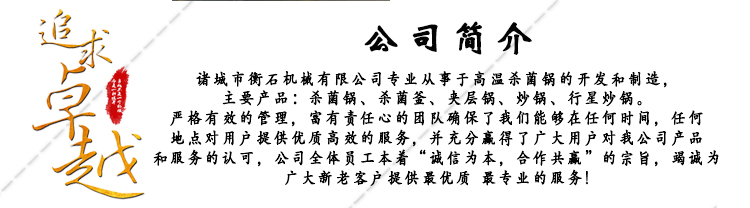 杀菌锅是通过直接注入蒸汽,使热水罐的水升温到预定温度,然后注入工艺罐,同时使锅内的工艺用水不断循环,并通过水汽混合器循环加热灭菌。从而缩短了杀菌时间,提高工作效率。杀菌的工艺水可循环使用,节省了能源、时间及人力、物力的消耗,降低了生产成本。
