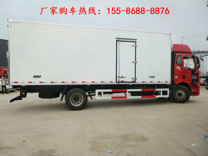 (2)、解放J6L 7米5箱体冷藏车,整车型号: CA5180XLCP62K1L2E5 ,底盘型号为:CA1180P62K1L2A1E5Z/CA1180P62K1L4E5,8档变速箱,5800mm轴距,378铸造桥,10.00R20 18钢丝胎,电动玻璃升降、驾驶员座椅为通风座椅、单 DIN北斗兼容车载系统、自动空调、电动液压举升、300L油箱、定速巡航、电调大灯、防飞溅挡泥板,大柴发动机 : CA6DH1-22E5,功率/马力:165kw/220马力,黄牌