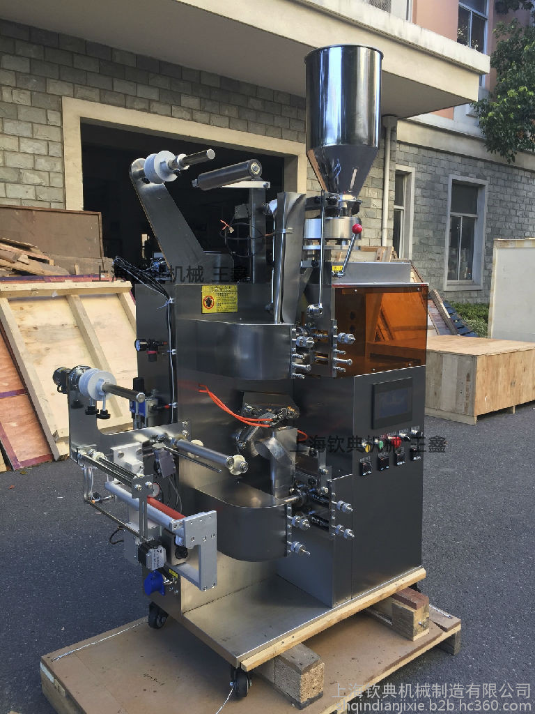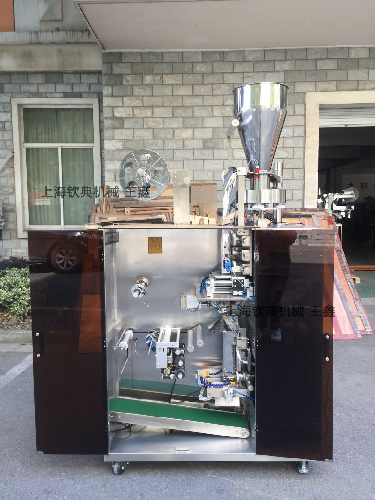 4.内袋封纸采用光纤跟踪定位,外袋封纸由步进电机控制,袋长稳定,光电眼跟踪定位,可通过电脑屏调节参数来自由设定袋长,袋宽更改需更换相应规格的制袋器。