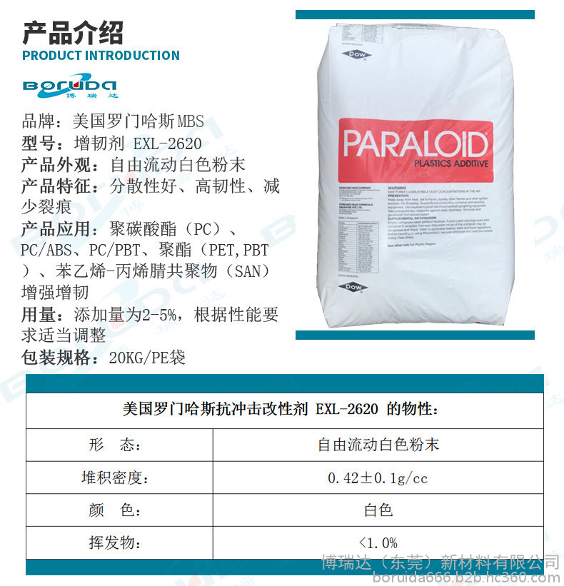 2、产品说明 PPARALOID EXL-2620 MBS抗冲击改性剂,