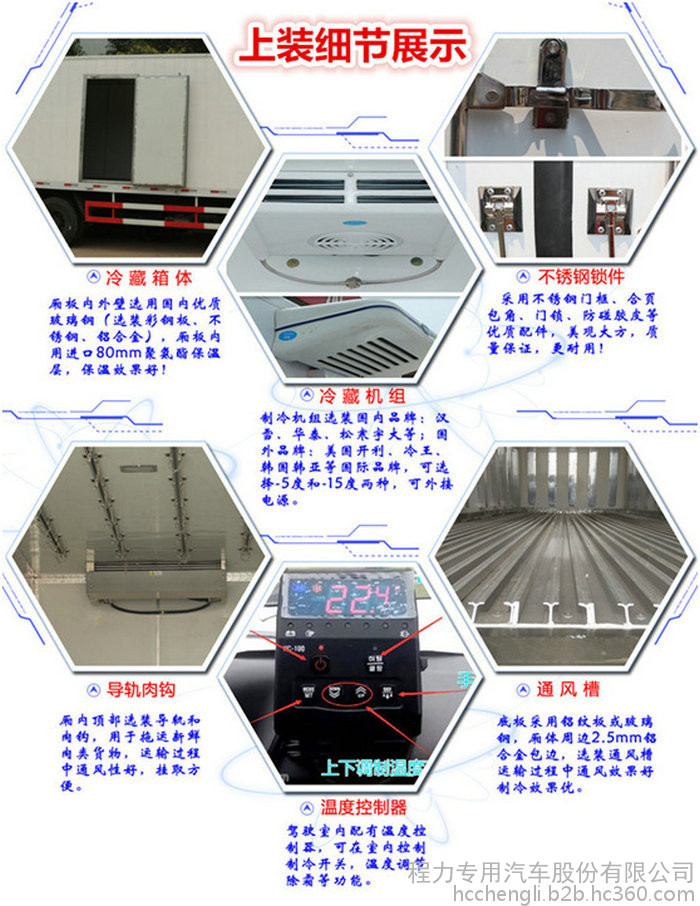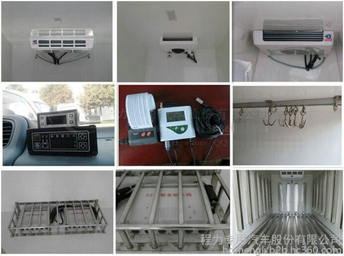 选装配置:导轨肉钩、T型通风槽、右侧开侧门、温度实时监控带打印装置、装海鲜厢体内部面料必须选装不锈钢制造、可选装12V-24V外接电源(车辆在停止时,厢体通过外接电源进行制冷)。