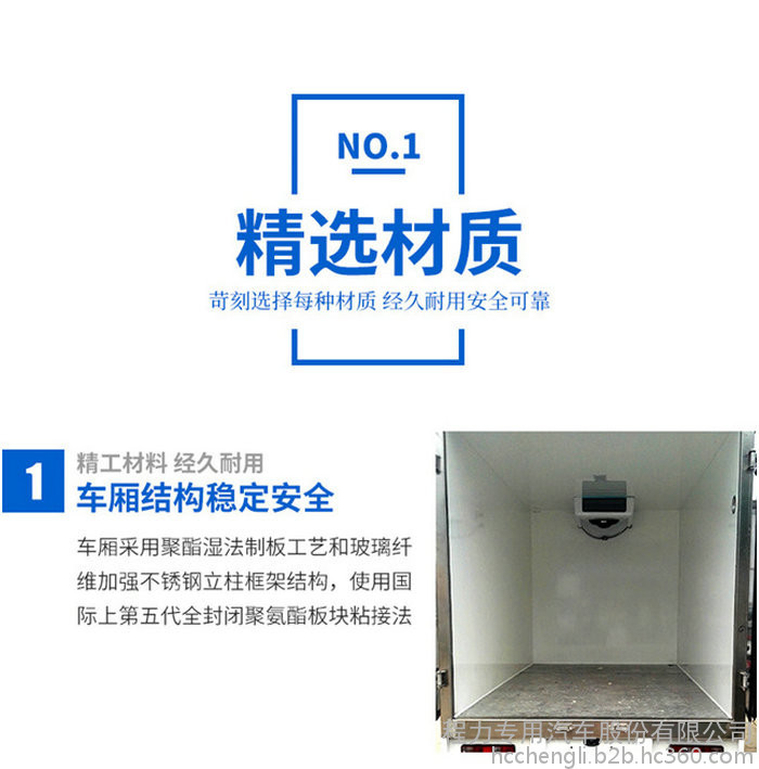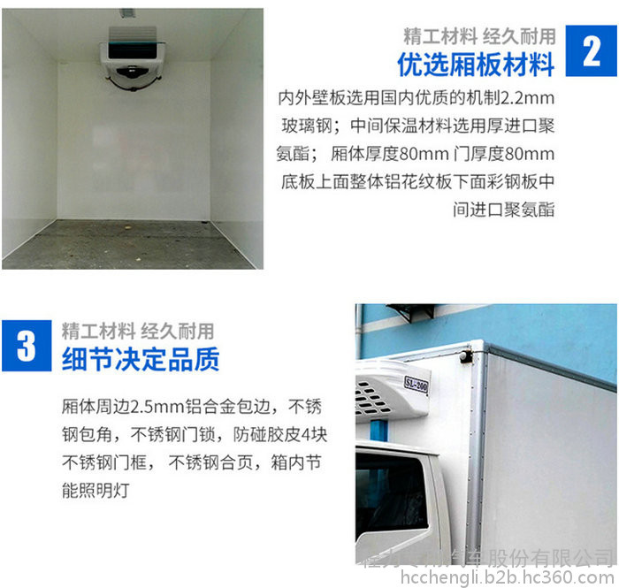 厢板材质:内外壁板选用国内优质的机制2.2mm玻璃钢;中间保温材料选用厚进口聚氨酯; 厢体厚度80mm门厚度80mm;底板上面整体铝花纹板,下面彩钢板,中间进口聚氨酯;