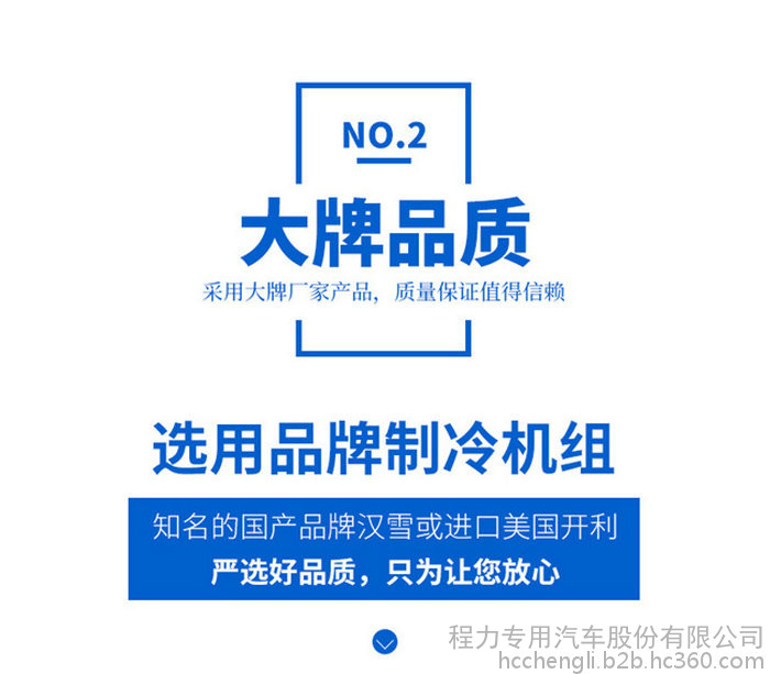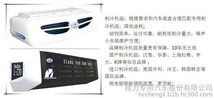 制冷机组:冷藏机组知名的国产品牌汉雪或华泰、凯利冷藏机组,厢体温度0上5度至0下18度; (可选配进口机组韩国韩亚,美国开利等)。