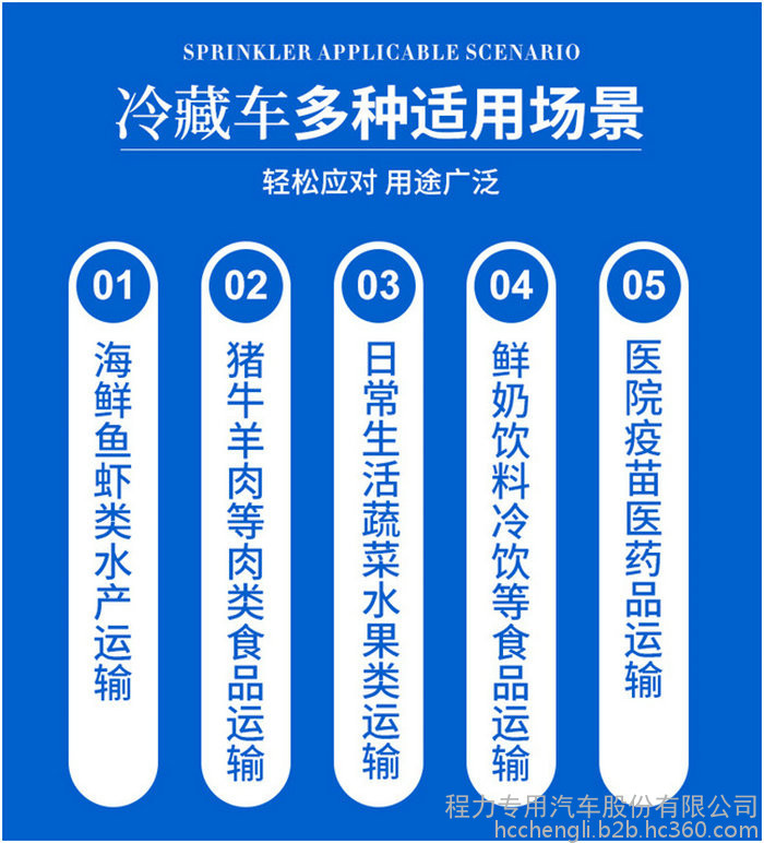 瓜果蔬菜冷藏车:蔬菜水果是鲜活食品,采收后易腐烂,在冷藏运输中要保持相对湿度和保证货物四周气流通风;其厢体采用全塑全封闭复合材料板块组合结构,内外蒙皮为玻璃钢板,中间夹层为聚氨酯发泡隔热材料,四侧用高强 度胶将玻璃钢板与聚氨酯泡沫材料粘合在一起,形成一种封闭性板块,并在拼装成厢体时用高强度胶粘结在一起,并用内埋高强度螺钉进行紧固。厢体具备重量轻、强度高、无接缝、外形美观、保温性好、耐腐蚀等特点。