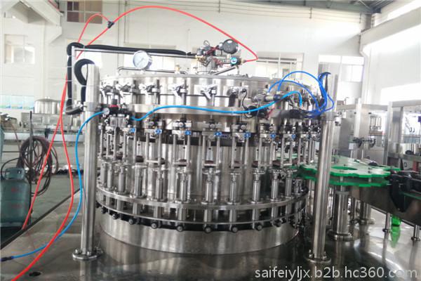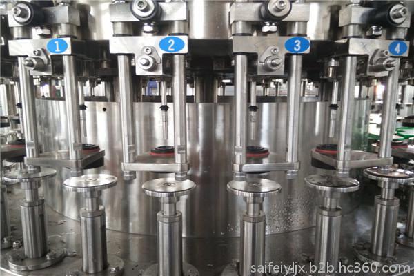 本系列设备用于聚脂瓶装碳酸饮料在一机上实现冲瓶、灌装、封盖。整机设计科学合理,外形美观,功能齐全,操作维修方便,自动化程度高。综合采用意大利、德国先进技术。灌装速度快,液面控制稳。采用风送进瓶、夹瓶口、冲洗、卡瓶口灌装、封盖、不受瓶子高矮限制,只要瓶口、瓶盖相同随意更换瓶形,更换一下拔轮板即可。油尼龙齿轮传动,噪声小,整机运转平稳。采用磁力扭矩式拧盖头,实现抓盖、拧盖功能。拧盖力矩无级可调,具有恒力矩旋封塑盖功能,且不伤盖,封口严密可靠。水平回转式气力理盖器,具有不损坏瓶盖表面,料斗内缺盖发信号自动补充盖等功能。整机采用PLC电脑程序控制及人机界面触摸屏按钮,具有料缸内液面自动控制,无瓶不灌装,无瓶不加盖功能,并有拨瓶星轮卡瓶错位停机,盖滑槽内缺盖停机等功能。