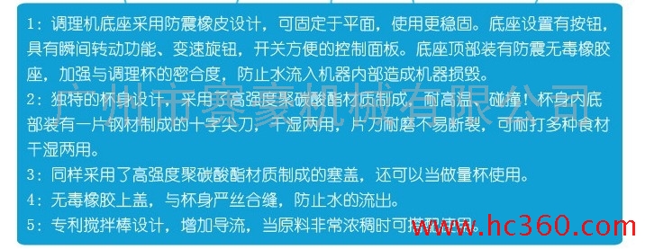 ★双安全防护-双重自动保护电路:过温度/过电流自动保护;★冷热两用**软件盖,省时高效, 技术紧密,隔音效果好;★独特“四角涡轮旋转搅拌”组合刀具,促使搅拌均匀;** ABS材质机体,性能稳定,清洗方便,造型大方美观。