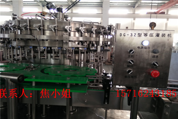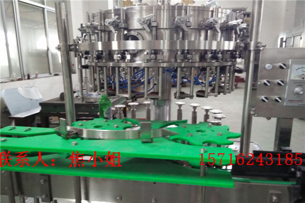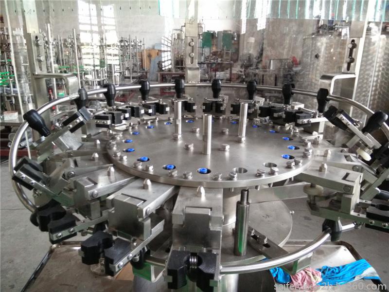 我厂生产的含气饮料三合一灌装线适合聚脂瓶装各种碳酸饮料的自动化生产。冲瓶、灌装、封盖自动完成。整机性能先进、实用美观,功能齐全,操作维修方便,自动化程度高,灌装速度快,液面控制稳定。如:无瓶时不灌装,冲气或灌装时爆瓶则灌装阀将自动关闭,并有自动冲洗等先进自控技术。采用托瓶提升气 缸,油尼龙齿轮传动,噪声小,整机运转平稳。采用磁力扭矩式拧盖头,实现抓盖、拧盖功能。拧盖力矩无级可调,具有恒力矩旋封塑盖功能,且不伤盖,封口严密可靠。水平回转式气力理盖器,具有不损坏瓶盖表面,料斗内缺盖发信号自动补充盖等功能。整机采用PLC电脑程序控制及人机界面触摸屏按钮,具有料缸内液面自动控制,无瓶不灌装,无瓶不加盖功能,并有拨瓶星轮卡瓶错位停机,盖滑槽内缺盖停机等功能。可根据用户的不同要求定做各类生产线。