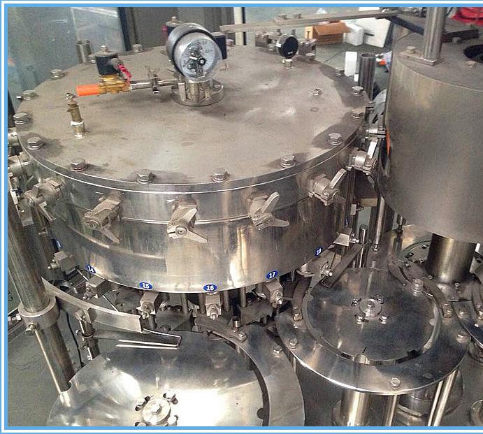 含气饮料三合一灌装机 汽水灌装机 含气饮料生产线 用于聚脂瓶装各种碳酸饮料的生产。在一机上实现冲瓶、灌装、封盖。整机设计科学合理、外形美观、功能齐全、操作。维修方便,自动化程度高。