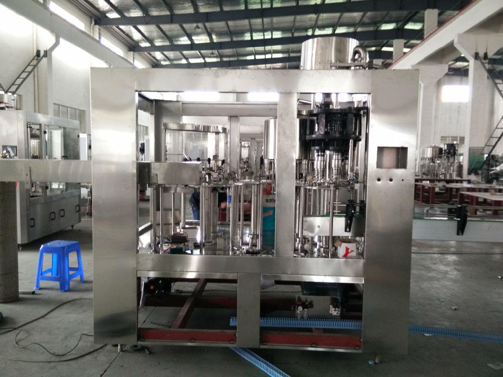 | 三合一主机由洗瓶机、灌装机、旋盖机、机架、封窗、主电机及传动系统、瓶传输细、理盖器及电气控制系统等部件组成。 洗瓶机的翻转机构,主要由分水盘、洗瓶夹、上转盘、导轨、防护罩、喷水装置、接水盘组成 灌装机构,主要由灌装桶、灌装阀、导轨、提升装置、卡瓶升降装置等组成。 封盖机构,由理盖器、落盖导轨及旋盖机三大部件组成。 辅助(或选配)设备有冲瓶水回流罐、进瓶风道和出瓶链,此外还可按客户要求配置人工上瓶平台(或理瓶机)、多排差速链式人工排瓶台、自动上盖机等。 |