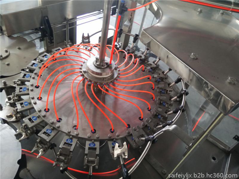 2、采用风送进瓶、夹瓶口、冲洗、卡瓶口灌装、封盖、不受瓶子高矮限制,只要瓶口、瓶盖相同随意更换瓶形,更换一下拔轮板即可。油尼龙齿轮传动,噪声小,整机运转平稳。