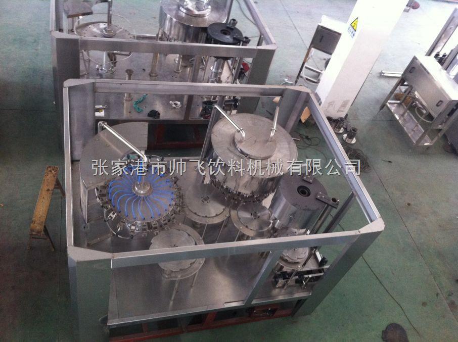 本系列设备用于聚脂瓶装各种纯净水、矿泉水的生产。在一机上实现冲瓶、灌装、封盖。整机设计科学合理,外形美观,功能齐全,操作维修方便,自动化程度高。综合采用意大利、德国先进技术。灌装速度快,液面控制稳。采用风送进瓶、夹瓶口、冲洗、卡瓶口灌装、封盖、不受瓶子高矮限制,只要瓶口、瓶盖相同随意更换瓶形,更换一下拔轮板即可。油尼龙齿轮传动,噪声小,整机运转平稳。采用磁力扭矩式拧盖头,实现抓盖、拧盖功能。拧盖力矩无级可调,具有恒力矩旋封塑盖功能,且不伤盖,封口严密可靠。水平回转式气力理盖器,具有不损坏瓶盖表面,料斗内缺盖发信号自动补充盖等功能。整机采用PLC电脑程序控制及人机界面触摸屏按钮,具有料缸内液面自动控制,无瓶不灌装,无瓶不加盖功能,并有拨瓶星轮卡瓶错位停机,盖滑槽内缺盖停机等功能。