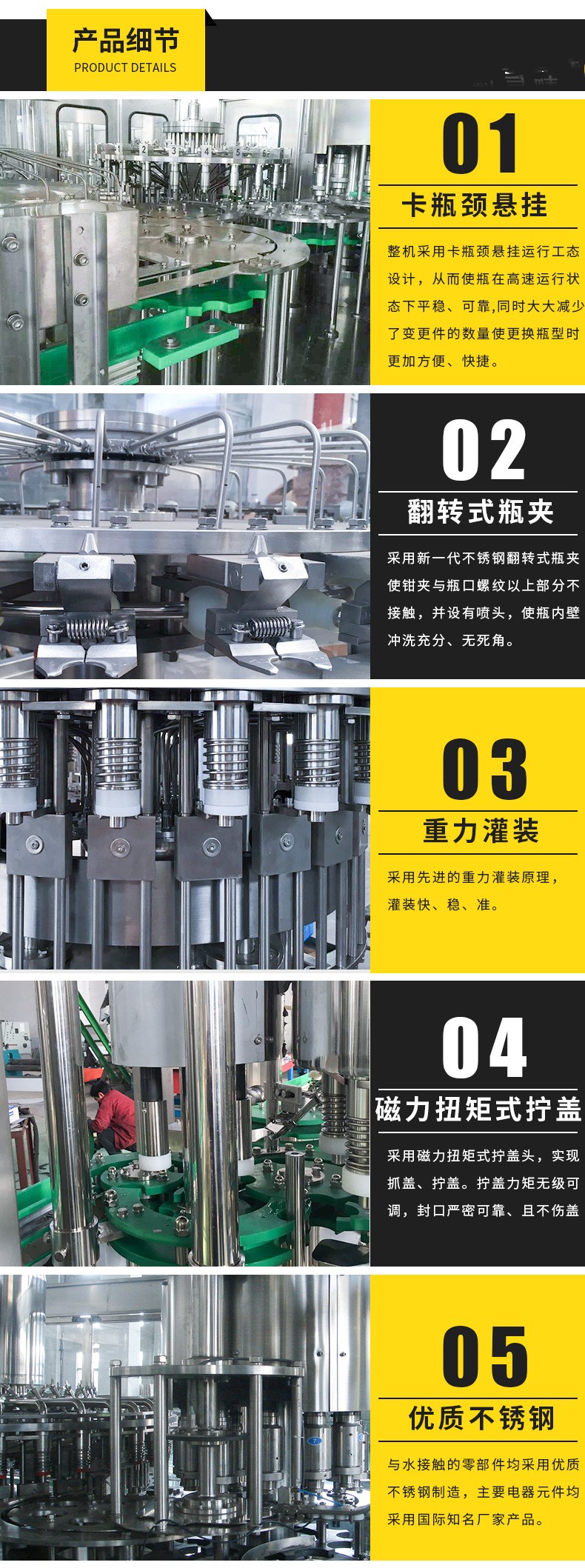 本系列设备集洗、灌、封为一体,适用于各种果汁饮料、茶饮料的热灌装生产,同时更换少量的零部件,便可用于纯净水、矿泉水的灌装。产量3000-36000瓶/小时,可供用户选择。采用先进的微负压重力式灌装原理,灌装快、稳、准,设有完善的物料回流系统,也可实现回流时独立回气,不与物料接触,减少物料二次污染及氧化。本机能满足95℃以下热灌装技术要求,灌装阀及物料进出管路无卫生死角,同时配有CIP自清洗接口,封盖前设有对瓶口RO水冲洗装置,以确保瓶口无发霉现象。采用磁力扭矩式拧盖头,实现抓盖、拧盖功能。拧盖力矩无级可调,具有恒力矩旋封塑盖功能。整机采用人机界面触摸屏控制、PLC电脑程序控制、变频器控制等先进技术。具有供盖系统自动控制、灌装温度自动检测、物料高温报警、低温停机并自动回流、无瓶不加盖、缺瓶等待、缺盖停机等功能。