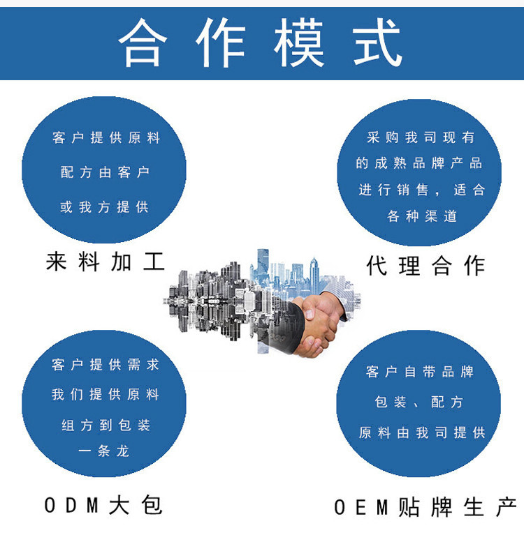 灵活的合作方式:OEM、ODM、OBM(包工包料、来料加工、、来配方加工等)