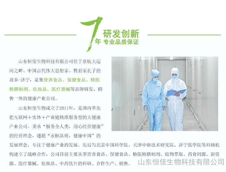 山东恒佳生物科技有限公司目前主要从事营养食品、保健食品、特医特膳制剂、植物萃取、药食同源、新资源、医疗器械、化妆品、中药饮片的科研、合作生产、销售。