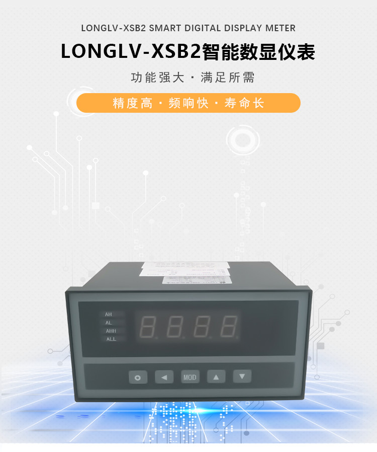 LONGLV-XSB2数字式智能仪表与各类模拟量输出的传感器、变送器配合,完成温度、压力、流量、液位、成分以及力和位移等物理量的测量、变换、显示、传送、记录和控制。误差小于0.2%FS,并具备调校、数字滤波功能,可帮助减小传感器、变送器的误差,有效提高系统的测量、控制精度,适用于电压、电流、热电阻、热电偶、mV、电位器、远传压力 表等信号类型可达8点报警输出,可选择10种报警方式,报警灵敏度独立设定。具备延时报警功能,有效防止干扰等原因造成误报变送输出可将测量、变换后的显示值以标准电流、电压形式输出供其它设备使用全透明、高速、高效的网络化通讯接口,实现计算机与仪表间完全的数据传送和控制。独有的控制权转移功能使计算机可以直接控制仪表的报警输出和变送输出。读取一次测量数据的时间小于10ms。