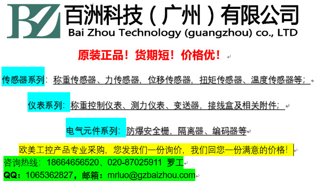 【百洲科技(广州)有限公司】是一家专门销售传感器、变送器、仪器仪表、工控设备等的高新技术企业。在这方面领域积累了多年经验和大量的解决方案。长期秉承以提供专业化产品和服务为宗旨以求实、务实、创新、维护商业信誉、不断满足客户的需求为行为理念,积极的创造客户的价值,提升行业的专业水平。