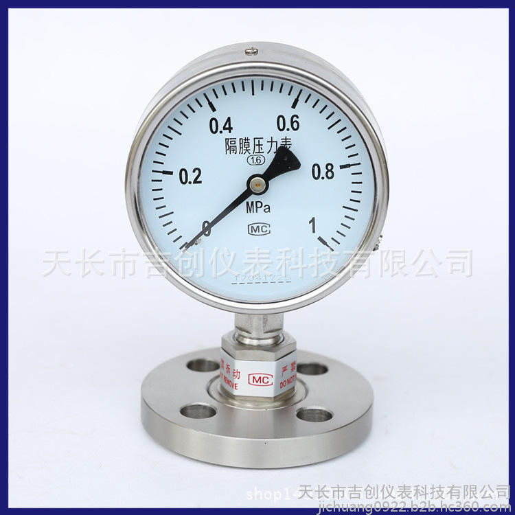 隔膜压力表由隔膜隔离器与通用型压力表组成一个系统的隔膜表,适用于测量强腐蚀、高温、高粘度、易结晶、易凝固、有固体浮游物的介质压力,以及必须避免测量介质直接进入通用型压力表和防止沉淀物积聚易情节的场合。隔膜压力表主要用于石油化工、制碱、化纤、染化、制药、食品和制酪等工业部门生产过程流量流体介质压力之用。
