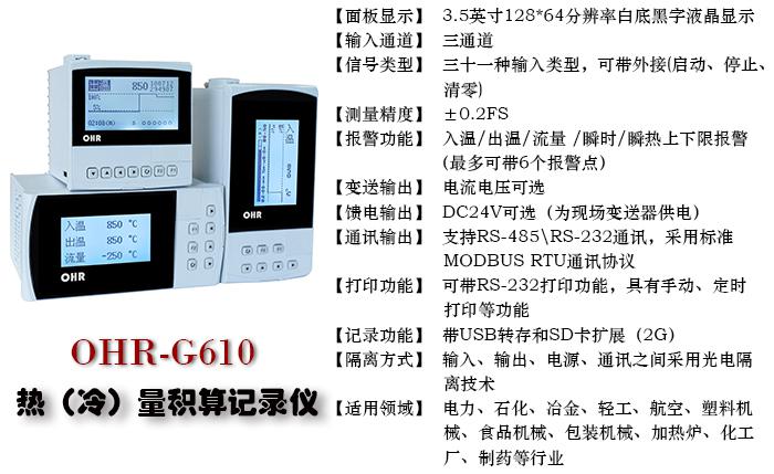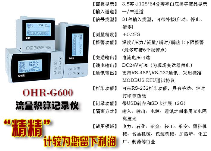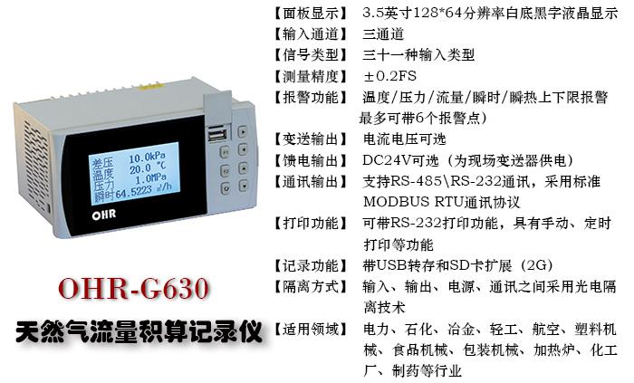 OHR-G600/G600R/G610/G610R/G630/G630R流量/热量/天然气流量积算仪/记录仪对现场温度、压力、流量等各种信号进行采集、显示、控制、远传、通讯、打印等处理,构成数字采集系统及控制系统,对气体、液体和蒸汽流量进行过程监测,总量累积及定量控制,同时可与V锥等多种流量传感器配套使用。