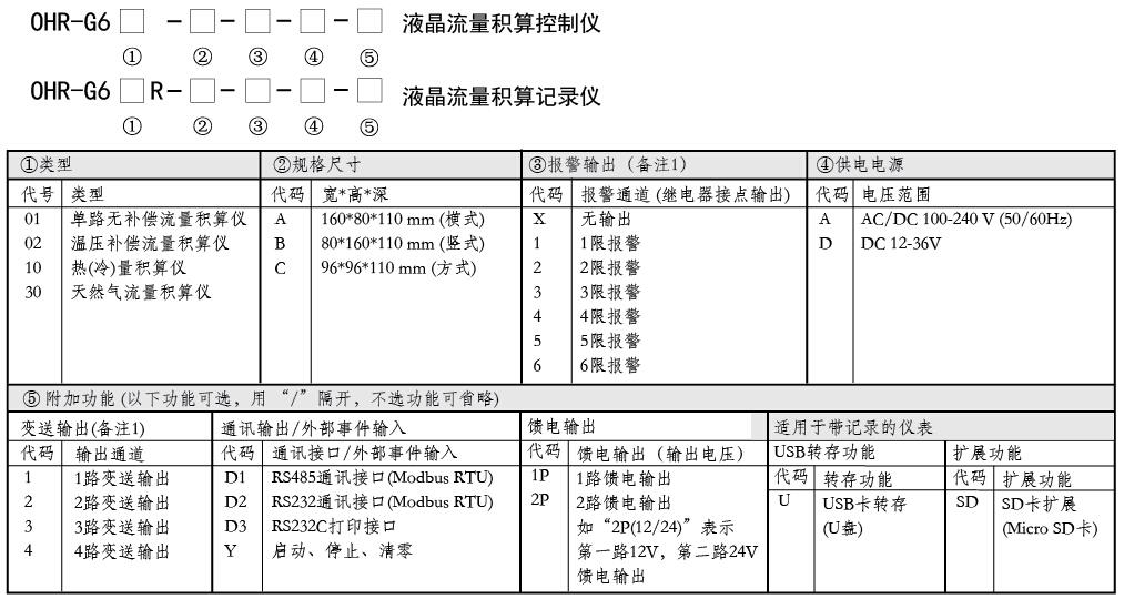 例:OHR-G602R-C-4-A-2/1P(流量、压力输入信号4~20mA,温度输入信号PT100,两路4~20mA输出)
