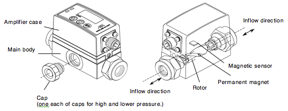 Features This sensor has a seven-segment LED digital display to make you read flow rate value easily.You can select one of two different kinds of output types: PNP output or NPN output.This sensor is used with a connector (M12×4-pin).You can use the digital flow sensor with an input power supply of from 12 to 24 V DC (permissible voltage fluctuation ±10 %).The amplifier protection structure conforms to IP67 equivalent.You can set the lower limit of the flow rate. If the flow rate falls below this limit, the red LED lamp (NG) turns on, and contact signal output is given to notify the operator of the critical situation.In the case of low pressure specifications, you can check the flow of fluid by observing the rotor rotation.You can use the sensor at the desired installation position (horizontal, vertical, or tilted position) and in the desired inflow direction.Rotor can be cleaned by air removing the cap from the front of the main body. |