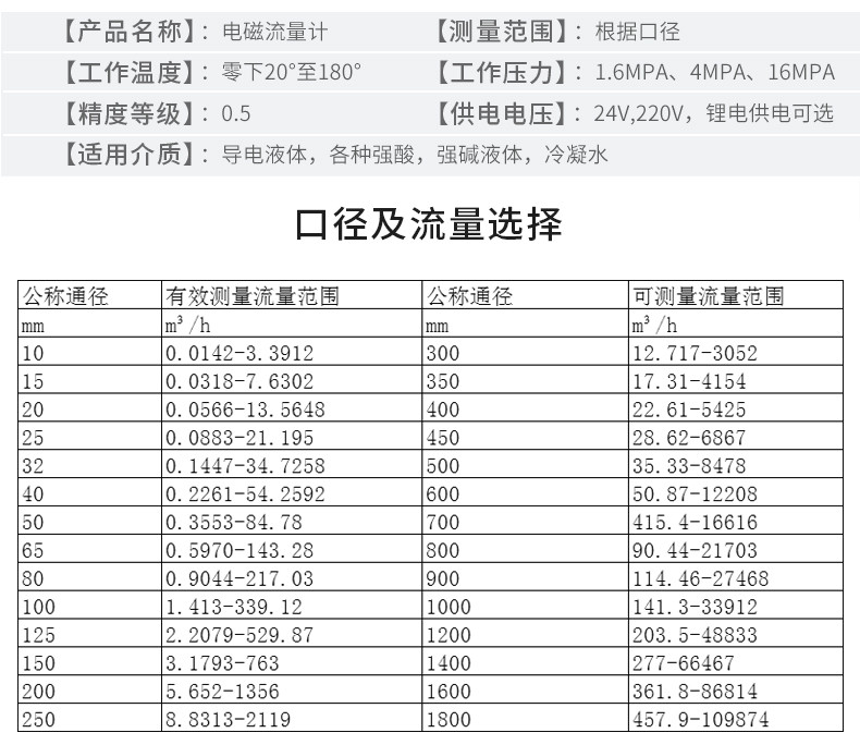 | 口径mm | 流量范围m3/h | 口径mm | 流量范围m3/h |