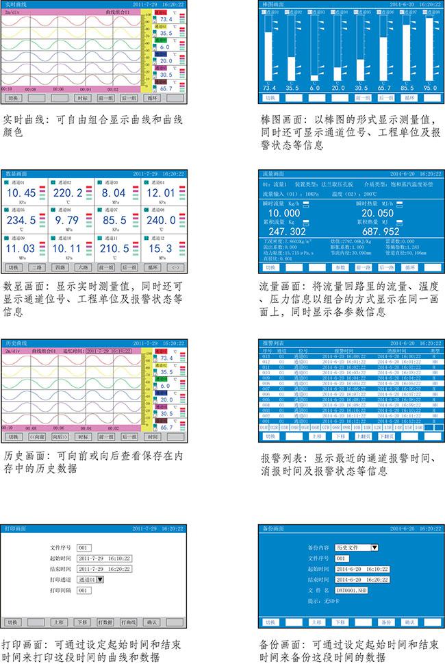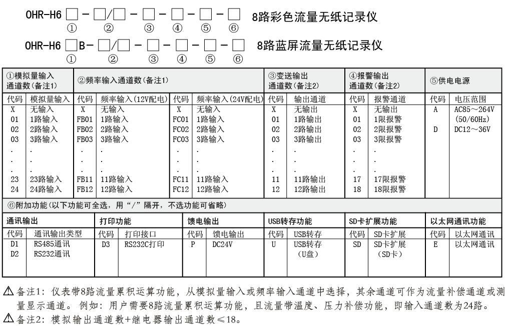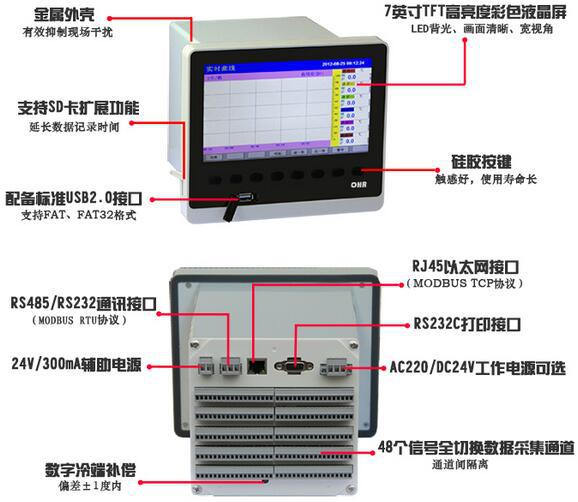 OHR-H600/H600B系列彩色/蓝屏流量无纸记录仪采用新型大规模集成电路,对输入、输出、电源、信号采取可靠保护和强抗干扰设计。24路万能输入(可组态选择输入:标准电压、标准电流、热电偶、热电阻、频率、毫伏等)其中可带8路流量输入。具有继电器报警输出,变送输出,流量积算,温压补偿功能;可带RS232/485通讯接口,以太网接口,微型打印机接口和USB接口,SD卡插座;可提供传感器配电;具有强大的显示功能,实时曲线显示,历史曲线追忆,棒图显示,报警状态显示,流量显示。