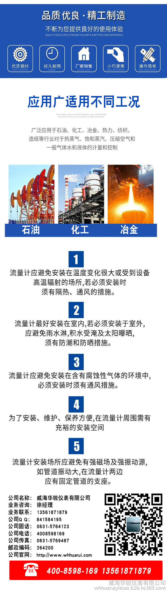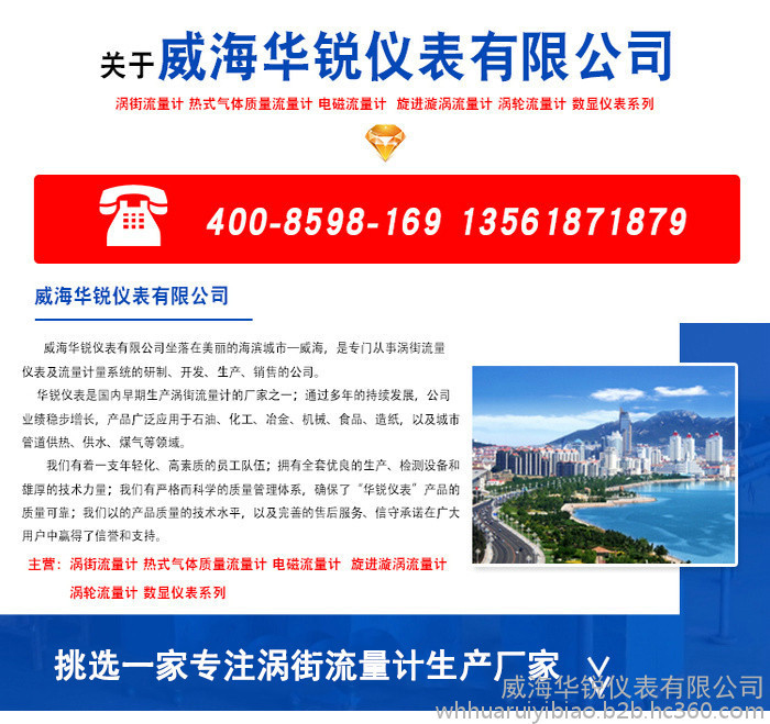 威海华锐仪表有限公司坐落在美丽的海滨城市——威海,是专门从事涡街流量仪表及流量计量系统的研制、开发、生产、销售的专 业公司。 华锐仪表是国内早期生产涡街流量计的厂家之一;通过多年的持续发展,公司业绩稳步增长,产品广泛应用于石油、化工、冶金、机械、食品、造纸,以及城市管道供热、供水、煤气等领域。 我们有着一支年轻化、高素质的员工队伍;拥有全套优良的生产、检测设备和雄厚的技术力量;我们有严格而科学的质量管理体系,确保了“华锐仪表”产品的质量可靠;我们以好的产品质量,好的技术水平,以及完善的售后服务、信守承诺在广大用户中赢得了信誉和支持。