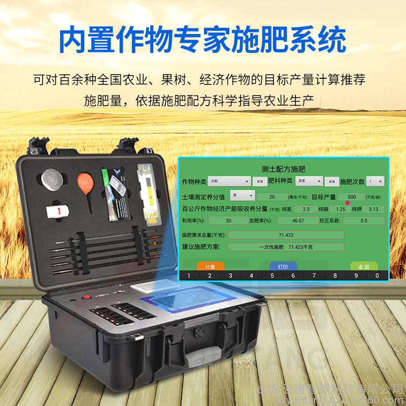 配套齐全:该仪器集药、器、仪为一体,携带方便,相当于一个小型实验室。适于农业服务部门或农资经销商、合作社、肥料厂商、大种植户测土施肥。