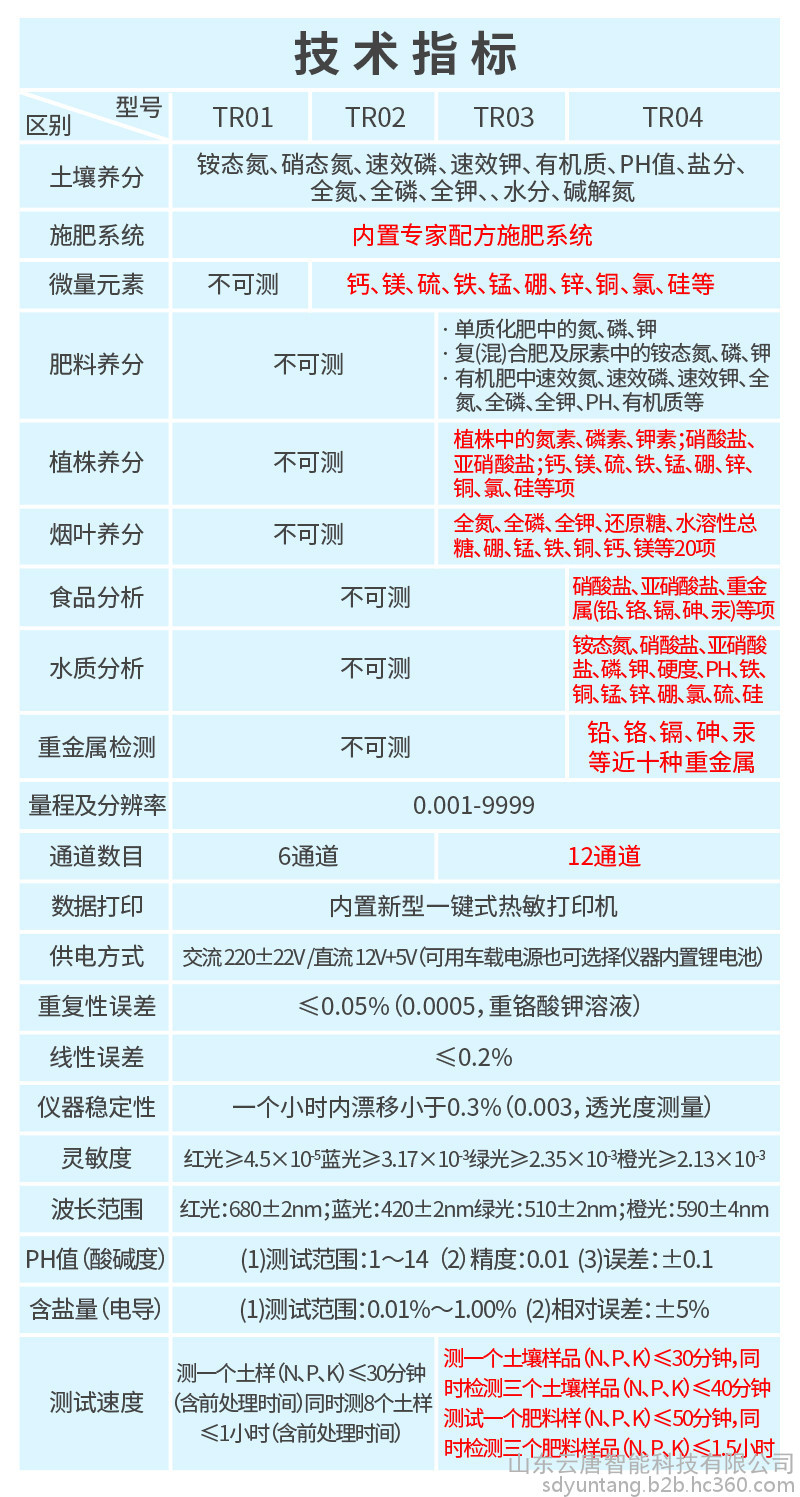 1、土壤养分:●铵态氮、硝态氮、速效磷、速效钾、有机质、全氮、pH值、含盐量、水分、碱解氮等十项;●中微量元素:钙、镁、硫、铁、锰、硼、锌、铜、氯、硅、钼等。
