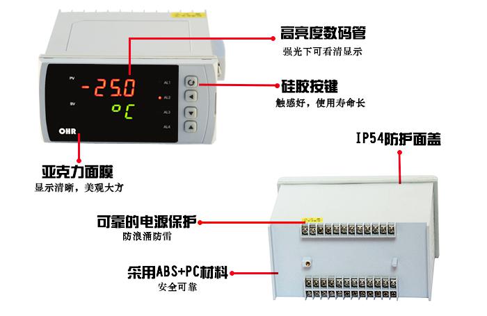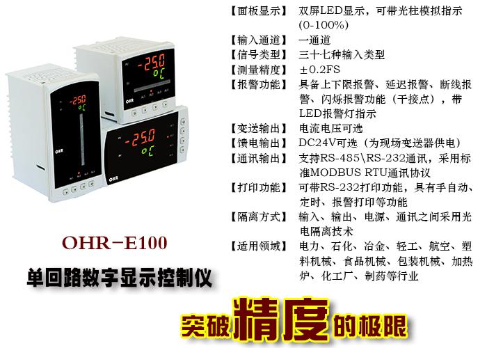 OHR-E100系列单回路数字显示控制仪针对现场温度、压力、液位、速度等各种信号进行采集、显示、控制、远传、通讯、打印等处理,构成数字采集系统及控制系统,广泛运用于电力、石化、冶金、轻工、制药、航空等诸多领域.