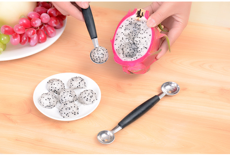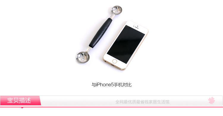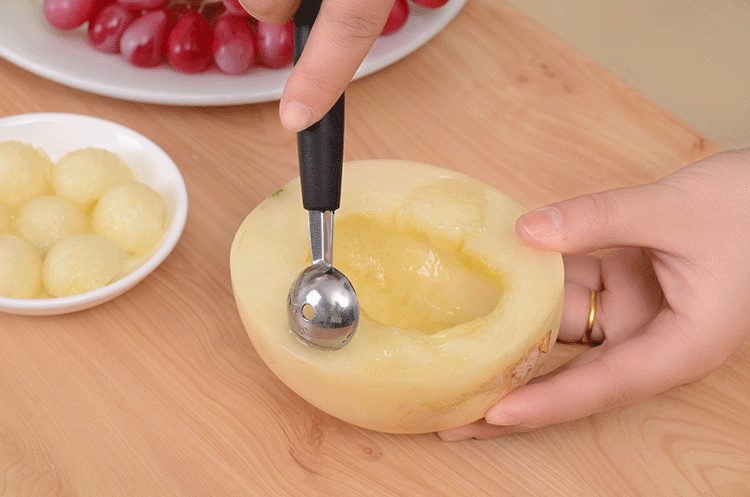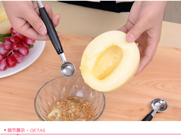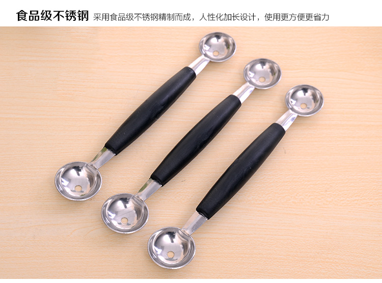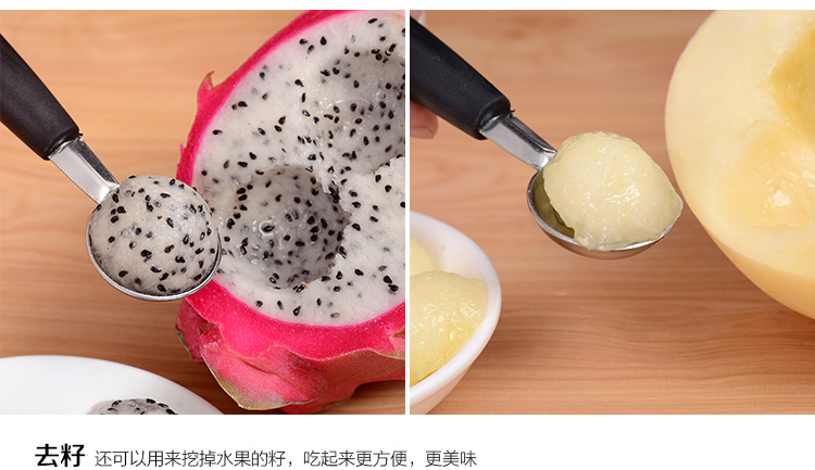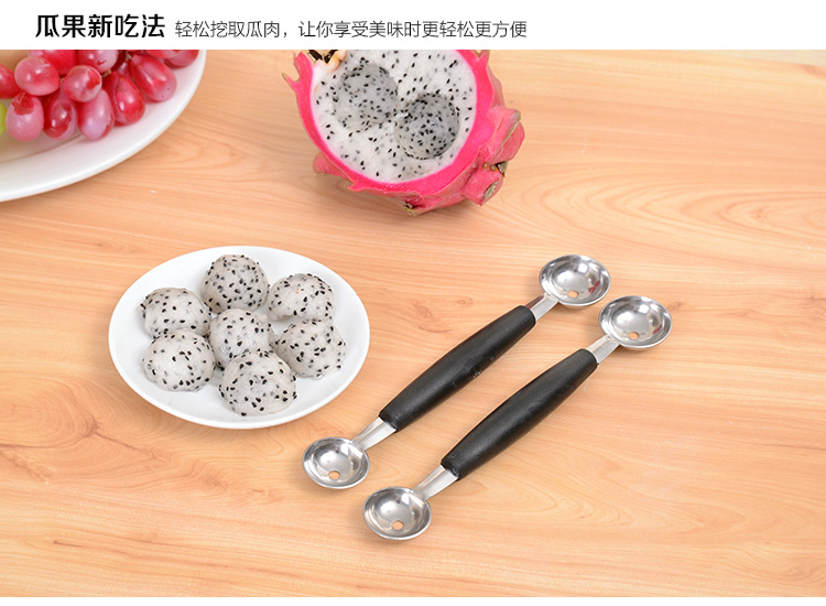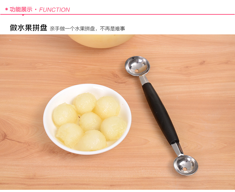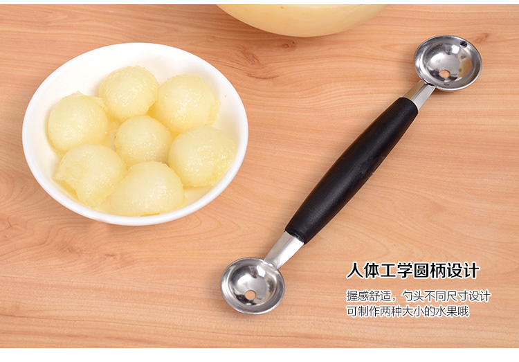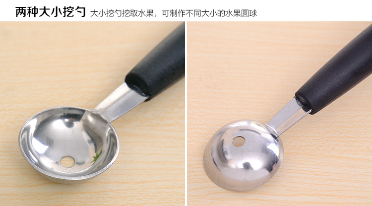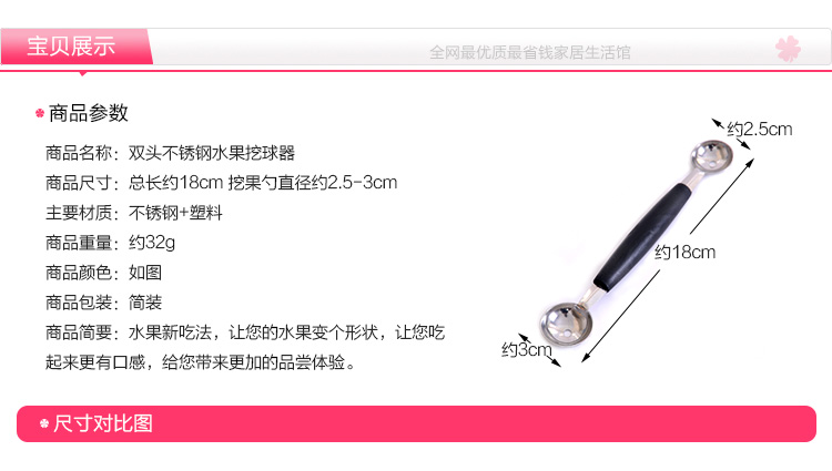 品名:西瓜勺/水果挖材质:不锈钢+pp产地:阳江规格:总长:18cm 勺直径:3/2.5cm 净重:32g上面报价是单支入PP袋包装,如需要插卡或吸卡或别的包装其他价格要联系客服