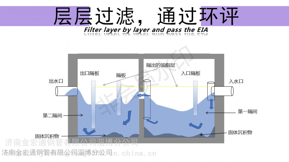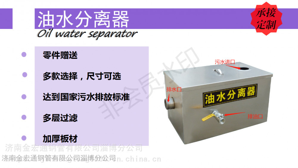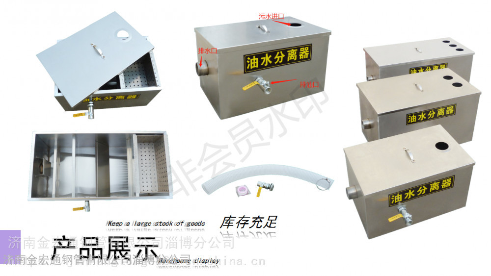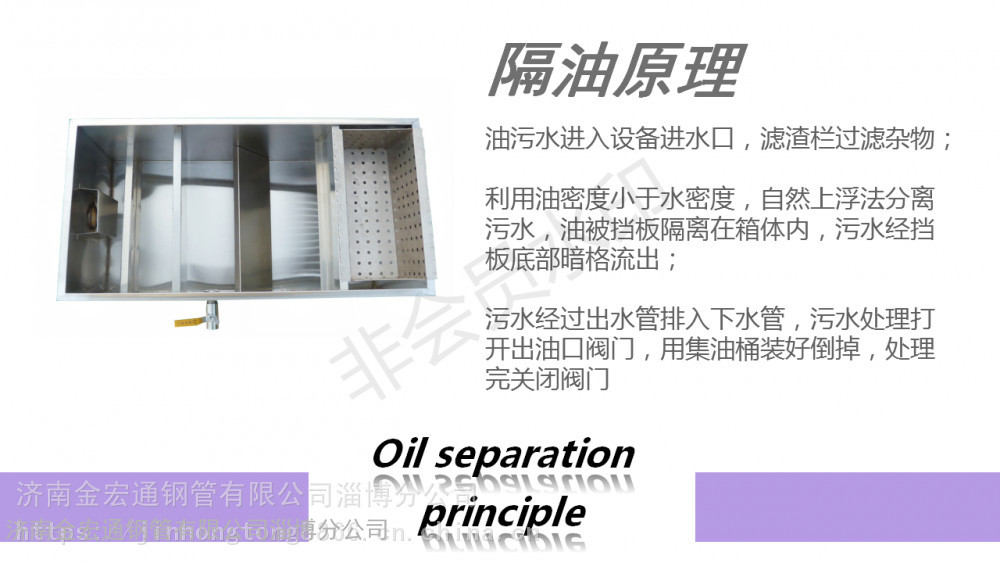 淄博金宏通不锈钢油水分离器是一种先进的油水分离器,各项技术参数指标均按照标准设计,可将废油回收再利用,既保护环境又可节约运行费用。该产品是含油污水在重力作用下,借助油水比重差,采用自然上浮法分离去除废水中的可浮油与部分细分散油。可以适用于各种矿物油、植物油、动物油或其混合物的含油水的油水分离,解决在寒冷季节由于油脂凝固所造成的下水道堵塞和污水漫溢等问题。广泛应用于酒楼、工厂、学校、机关、生活小区等场所生活污水的处理,以及汽修厂、机修厂、油站和工矿企业等场所工业含油废水的分离。