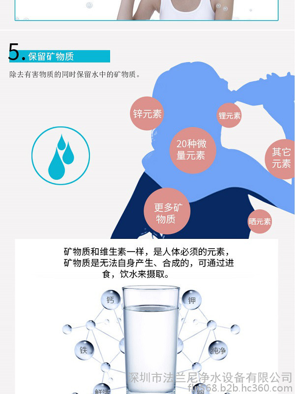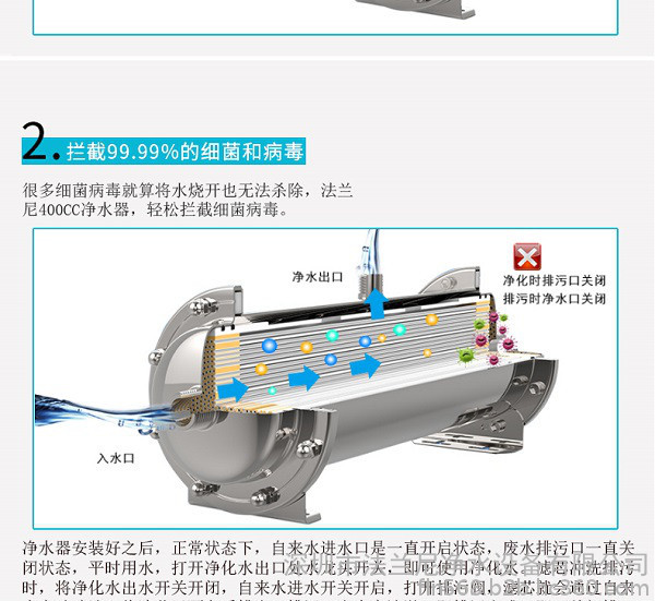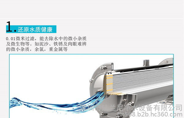 净化水质 高效去除水中,泥沙、铁锈、细菌、病毒、高分子有机物,同时保留水中对人体有益的矿物质和微量元素,抑菌MTF技术,全面抑制水中有害病菌。