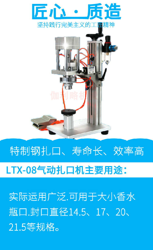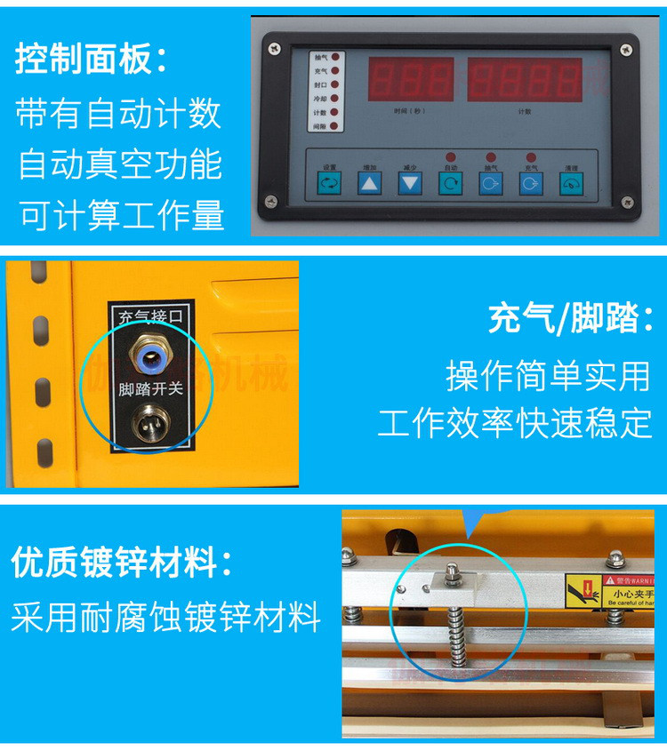 气动封口机是利用压缩空气作为动力,电器脉冲技术封口。使封口材料平整、挺刮、效果好。封口形状分为直线形、圆形、弧形、八字形、斜边形、不规则形等等。广泛用于铝塑复合膜、纸塑复合膜、PVC、PP、PE等热塑性塑料的制袋封口。气动封口机是一种新颖的气电一体化包装机械,是柔软物质、储存、产品防潮运输领域中不可缺少的必要手段。该机采用压缩空气作动力,封口压力可调,质量稳定可靠,可以手动或脚踏开关操作,轻便简易。在化工,粮食,食品,饲料等行业得到广泛应用。