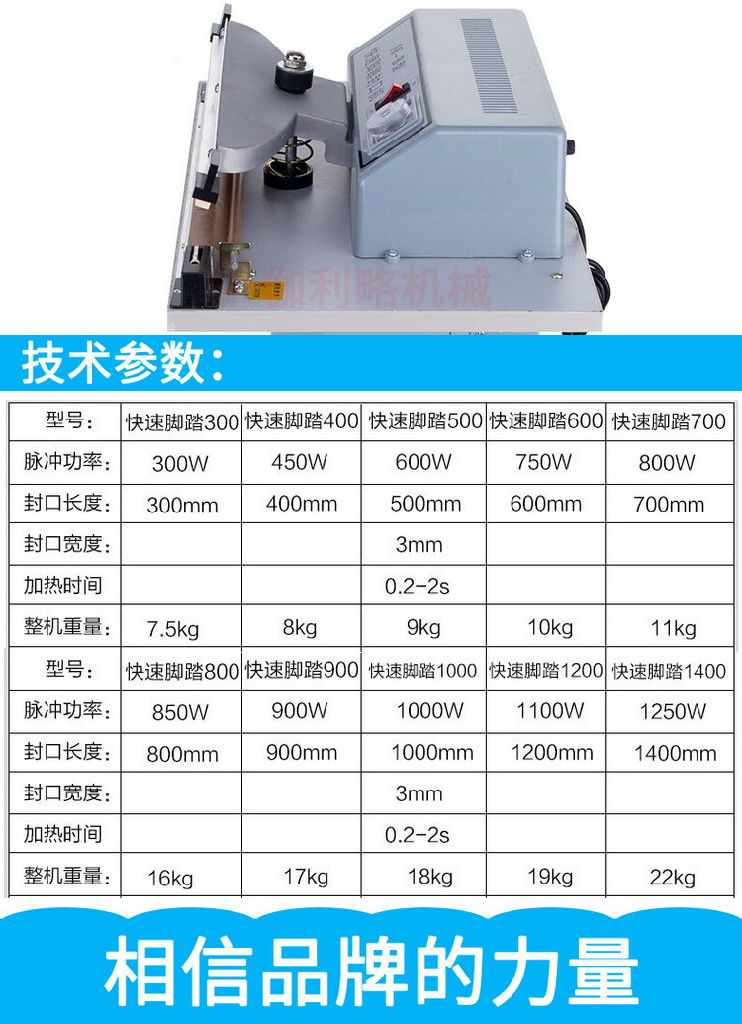 3、当输入电源电压高于250V或低于160V时(面板电压显示屏中显示值)应停止封口操作,待电源电压回复正常后或者加装自动稳压器,再进行封口。